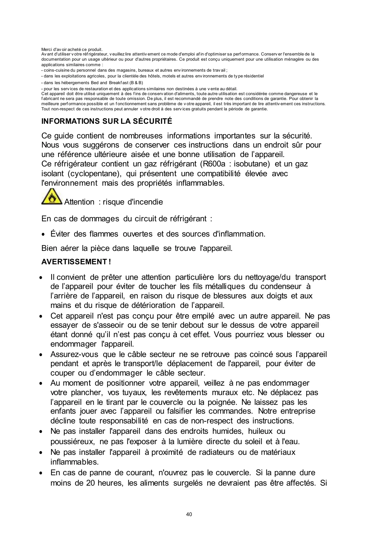 Nous vous suggérons de conserver ces instructions dans un endroit sûr pour une référence ultérieure aisée et une bonne utilisation de l’appareil. Ce réfrigérateur contient un gaz réfrigérant (R600a : isobutane) et un gaz isolant (cyclopentane), qui présentent une compatibilité élevée avec l'environnement mais des propriétés inflammables. Attention : risque d'incendie En cas de dommages du circuit de réfrigérant : • Éviter des flammes ouvertes et des sources d'inflammation. Bien aérer la pièce dans laquelle se trouve l'appareil. AVERTISSEMENT !