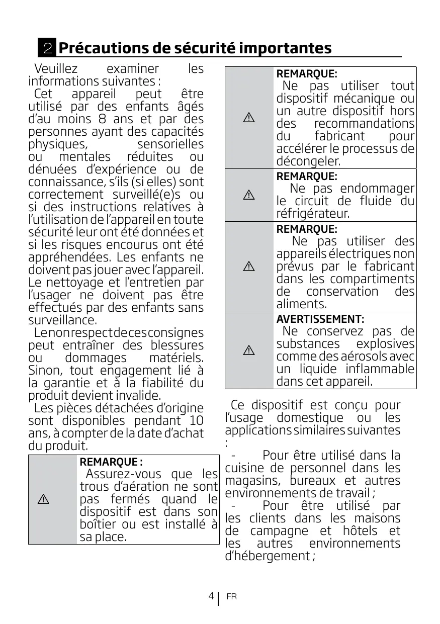 EBMJNFOUBUJPOQPSUBCMFTË l’arrière de l’appareil. t -FTFOGBOUTÉHÏTEFËBOT TPOUBVUPSJTÏTËDIBSHFSFU EÏDIBSHFSMFTSÏGSJHÏSBUFVST t Pour éviter la contamination EFTBMJNFOUT WFVJMMF[ respecter les instructions TVJWBOUFT t -PVWFSUVSFQSPMPOHÏFEFMB porte peut provoquer une BVHNFOUBUJPOTJHOJGJDBUJWFEF la température dans l’appareil. t /FUUPZF[SÏHVMJÒSFNFOUMFT surfaces qui peuvent entrer en contact avec les aliments FUMFTTZTUÒNFTEFESBJOBHF accessibles. t /FUUPZF[MFTSÏTFSWPJST d’eau s’ils n’ont pas été VUJMJTÏTEFQVJTISJODF[MF TZTUÒNFEFBVSBDDPSEÏËVOF alimentation en eau si l’eau n’a pas été pompée depuis 5 jours. t $POTFSWF[MBWJBOEFFU le poisson crus dans des récipients appropriés au SÏGSJHÏSBUFVS EFGBÎPOËDF qu’ils ne soient pas en contact avec d’autres aliments ou ne HPVUUFOUEFTTVT t -FTDPNQBSUJNFOUTËBMJNFOUT TVSHFMÏTEFVYÏUPJMFT DPOWJFOOFOUËMBDPOTFSWBUJPO EBMJNFOUTQSÏDPOHFMÏT ËMBDPOTFSWBUJPOPVËMB GBCSJDBUJPOEFHMBDFFUHMBÎPOT