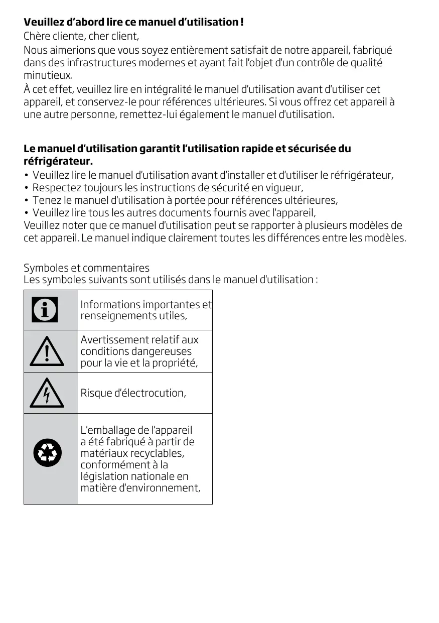 Veuillez lire le manuel d'utilisation avant d'installer et d'utiliser le réfrigérateur, Respectez toujours les instructions de sécurité en vigueur, Tenez le manuel d'utilisation à portée pour références ultérieures, Veuillez lire tous les autres documents fournis avec l'appareil, Veuillez noter que ce manuel d'utilisation peut se rapporter à plusieurs modèles de cet appareil. Le manuel indique clairement toutes les différences entre les modèles. Symboles et commentaires Les symboles suivants sont utilisés dans le manuel d'utilisation :
