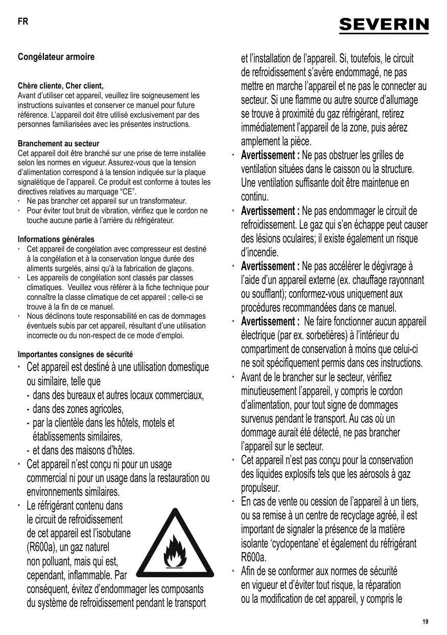 Avertissement : Ne pas obstruer les grilles de ventilation situées dans le caisson ou la structure. Une ventilation suffisante doit être maintenue en continu. Avertissement : Ne pas endommager le circuit de refroidissement. Le gaz qui s’en échappe peut causer des lésions oculaires; il existe également un risque d’incendie. Avertissement : Ne pas accélérer le dégivrage à l’aide d’un appareil externe (ex. chauffage rayonnant ou soufflant); conformez-vous uniquement aux procédures recommandées dans ce manuel. Avertissement : Ne faire fonctionner aucun appareil électrique (par ex. sorbetières) à l’intérieur du compartiment de conservation à moins que celui-ci ne soit spécifiquement permis dans ces instructions. Avant de le brancher sur le secteur, vérifiez minutieusement l’appareil, y compris le cordon d’alimentation, pour tout signe de dommages survenus pendant le transport. Au cas où un dommage aurait été détecté, ne pas brancher l’appareil sur le secteur. Cet appareil n’est pas conçu pour la conservation des liquides explosifs tels que les aérosols à gaz propulseur. En cas de vente ou cession de l’appareil à un tiers, ou sa remise à un centre de recyclage agréé, il est important de signaler la présence de la matière isolante ‘cyclopentane’ et également du réfrigérant R600a. Afin de se conformer aux normes de sécurité en vigueur et d’éviter tout risque, la réparation ou la modification de cet appareil, y compris le 19