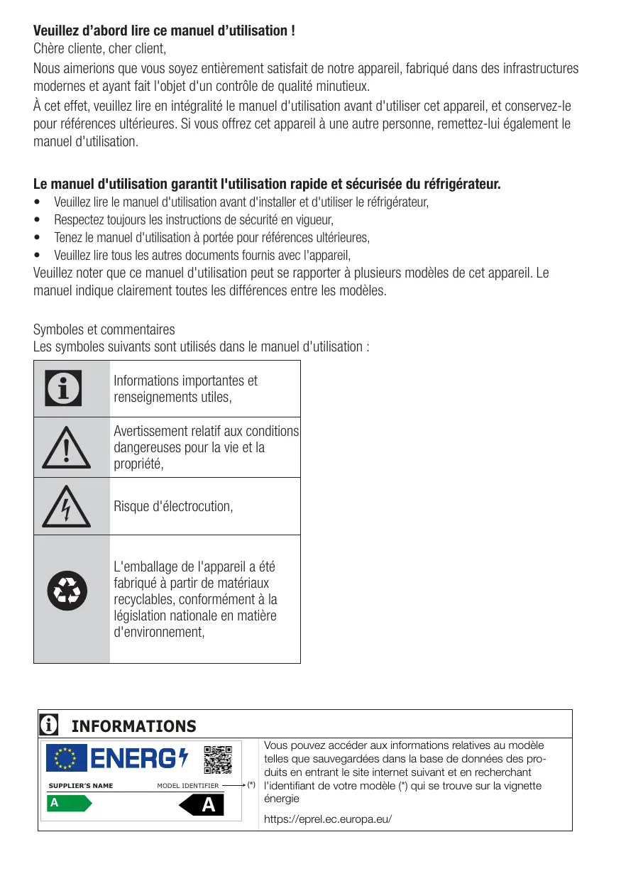 Le manuel d'utilisation garantit l'utilisation rapide et sécurisée du réfrigérateur. • • • Veuillez lire tous les autres documents fournis avec l'appareil,