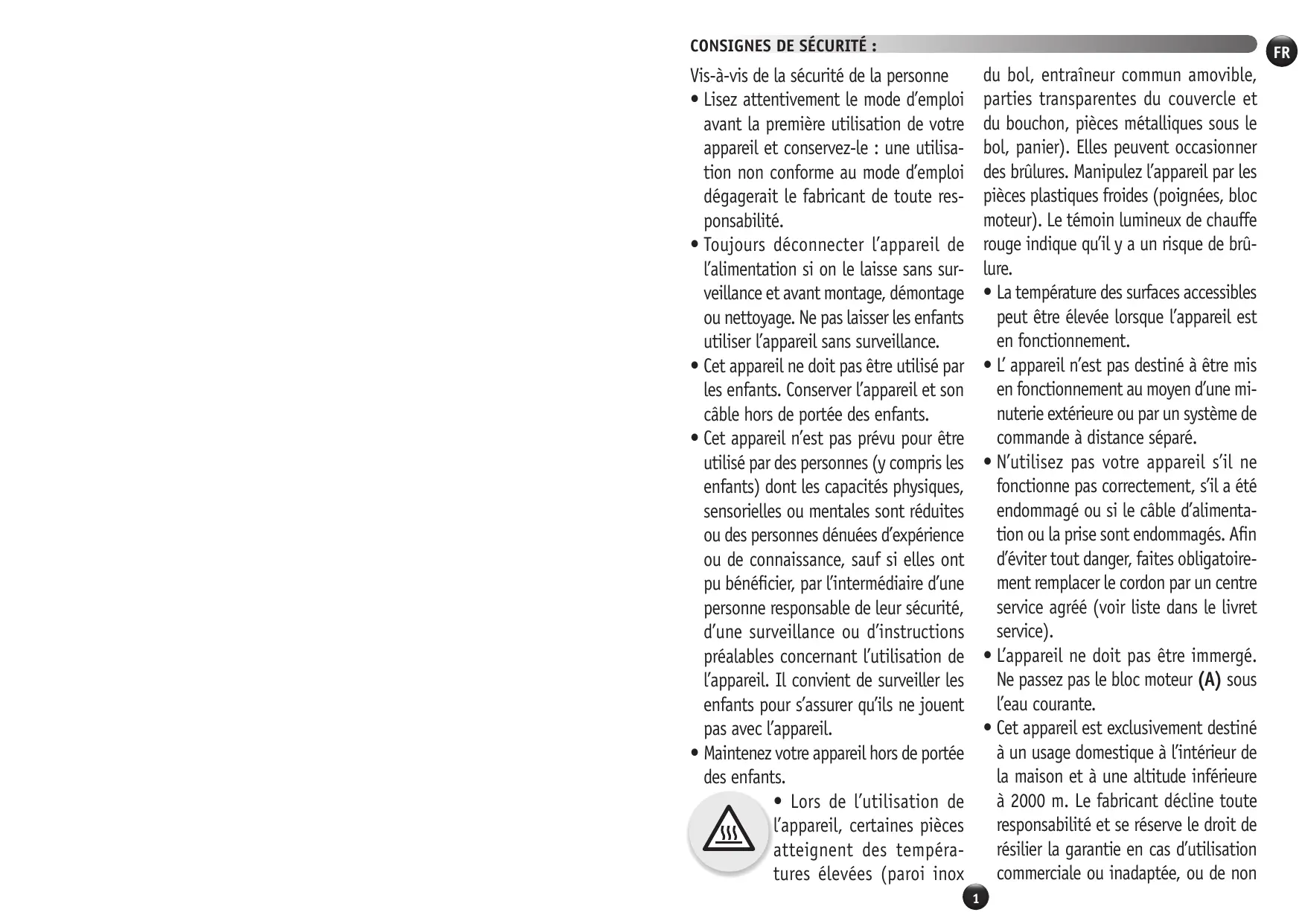 • Lisez attentivement le mode d’emploi avant la première utilisation de votre appareil et conservez-le : une utilisation non conforme au mode d’emploi dégagerait le fabricant de toute responsabilité. • Toujours déconnecter l’appareil de l’alimentation si on le laisse sans surveillance et avant montage, démontage ou nettoyage. Ne pas laisser les enfants utiliser l’appareil sans surveillance. • Cet appareil ne doit pas être utilisé par les enfants. Conserver l’appareil et son câble hors de portée des enfants. • Cet appareil n’est pas prévu pour être utilisé par des personnes (y compris les enfants) dont les capacités physiques, sensorielles ou mentales sont réduites ou des personnes dénuées d’expérience ou de connaissance, sauf si elles ont pu bénéficier, par l’intermédiaire d’une personne responsable de leur sécurité, d’une surveillance ou d’instructions préalables concernant l’utilisation de l’appareil. Il convient de surveiller les enfants pour s’assurer qu’ils ne jouent pas avec l’appareil. • Maintenez votre appareil hors de portée des enfants. • Lors de l’utilisation de l’appareil, certaines pièces atteignent des températures élevées (paroi inox 1