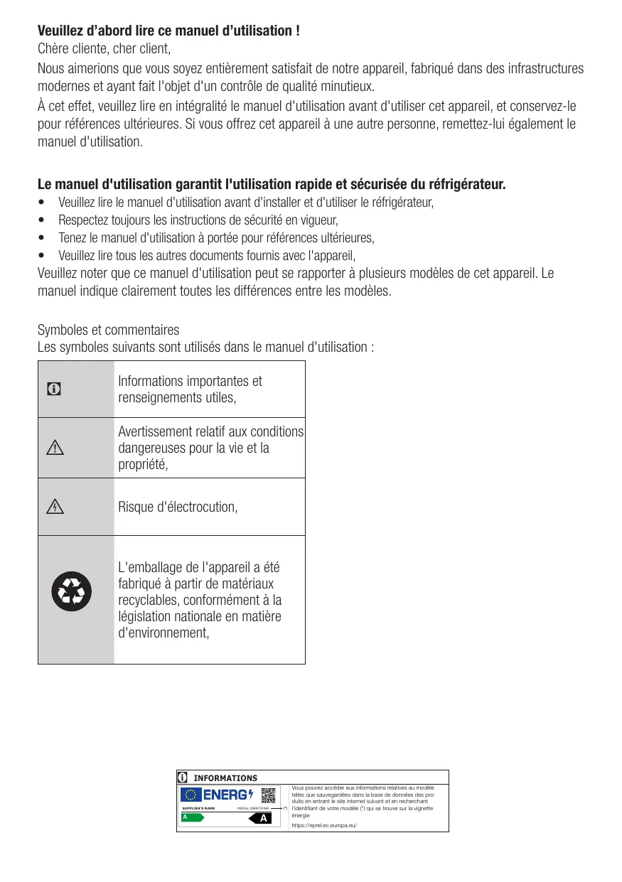 Chère cliente, cher client, Nous aimerions que vous soyez entièrement satisfait de notre appareil, fabriqué dans des infrastructures modernes et ayant fait l'objet d'un contrôle de qualité minutieux. À cet effet, veuillez lire en intégralité le manuel d'utilisation avant d'utiliser cet appareil, et conservez-le pour références ultérieures. Si vous offrez cet appareil à une autre personne, remettez-lui également le manuel d'utilisation. Le manuel d'utilisation garantit l'utilisation rapide et sécurisée du réfrigérateur. • • • •