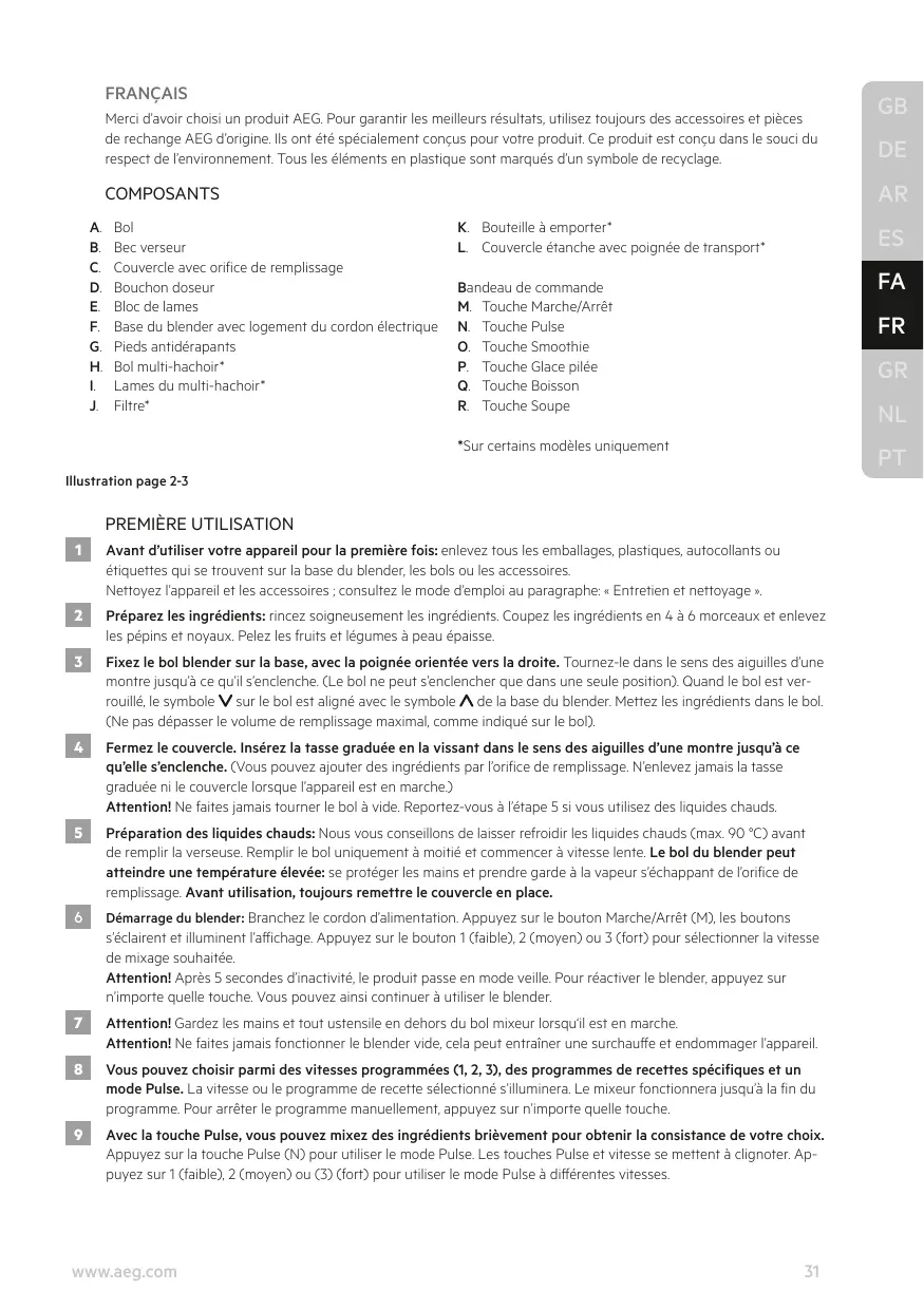 FRANÇAIS Merci d’avoir choisi un produit AEG. Pour garantir les meilleurs résultats, utilisez toujours des accessoires et pièces de rechange AEG d’origine. Ils ont été spécialement conçus pour votre produit. Ce produit est conçu dans le souci du respect de l’environnement. Tous les éléments en plastique sont marqués d’un symbole de recyclage.