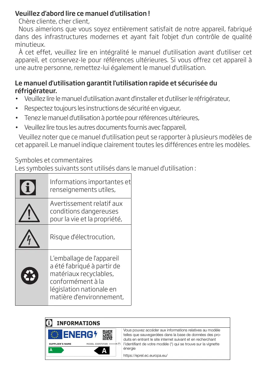 • For a freestanding appliance; ‘this refrigerating appliance is not intended to be used as a built-in appliance. between the two doors, on the side panels and at the rear grill while the product is operating. This is normal and does not require service maintenance!Be careful when touching these areas. Le manuel d'utilisation garantit l'utilisation rapide et sécurisée du réfrigérateur. • Veuillez lire le manuel d'utilisation avant d'installer et d'utiliser le réfrigérateur, • Respectez toujours les instructions de sécurité en vigueur, • Tenez le manuel d'utilisation à portée pour références ultérieures, • Veuillez lire tous les autres documents fournis avec l'appareil, Veuillez noter que ce manuel d'utilisation peut se rapporter à plusieurs modèles de cet appareil. Le manuel indique clairement toutes les différences entre les modèles. Symboles et commentaires Les symboles suivants sont utilisés dans le manuel d'utilisation :