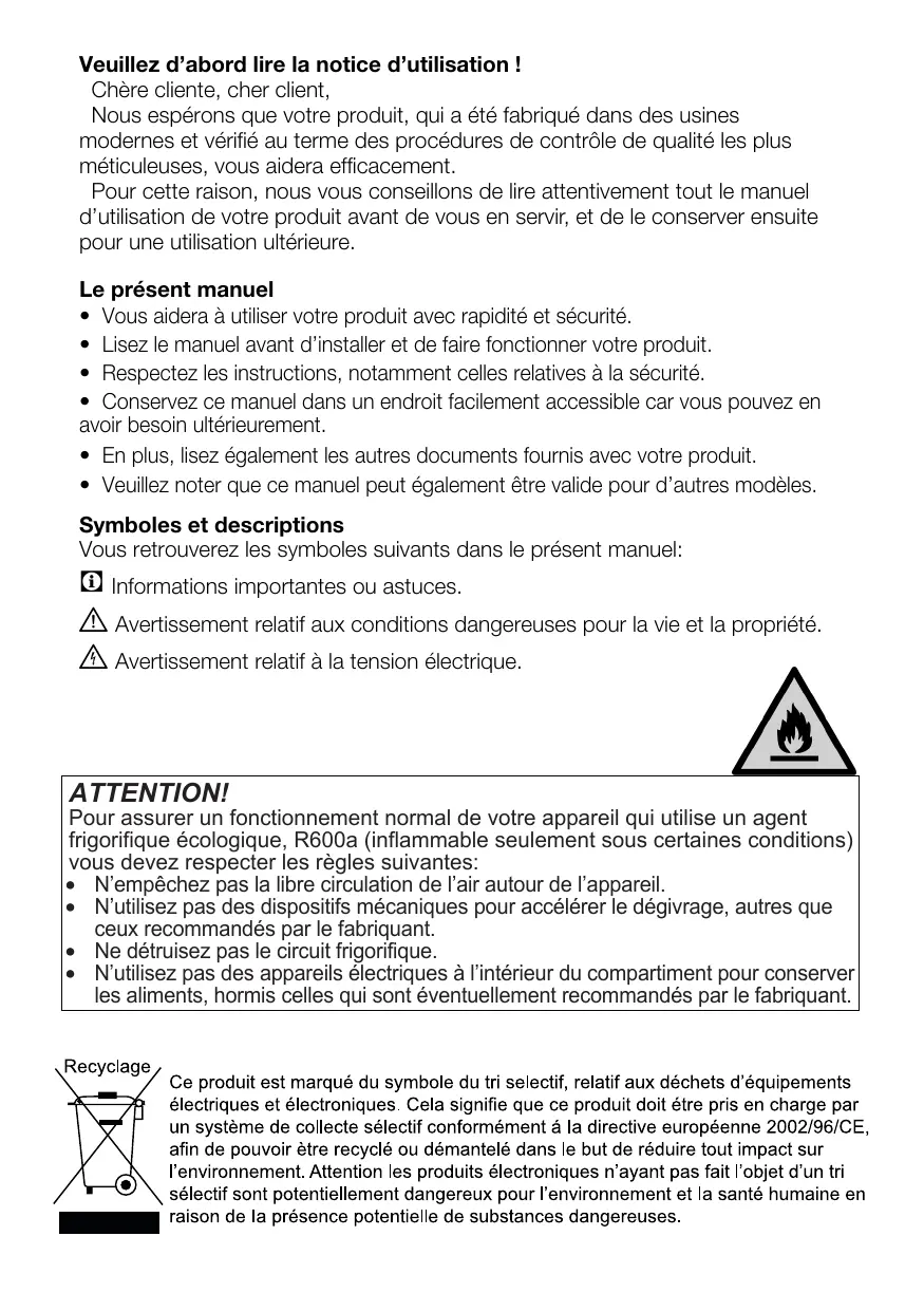 Pour assurer un fonctionnement normal de votre appareil qui utilise un agent frigorifique écologique, R600a (inflammable seulement sous certaines conditions) vous devez respecter les règles suivantes: • N’empêchez pas la libre circulation de l’air autour de l’appareil. • N’utilisez pas des dispositifs mécaniques pour accélérer le dégivrage, autres que ceux recommandés par le fabriquant. • Ne détruisez pas le circuit frigorifique. • N’utilisez pas des appareils électriques à l’intérieur du compartiment pour conserver les aliments, hormis celles qui sont éventuellement recommandés par le fabriquant.