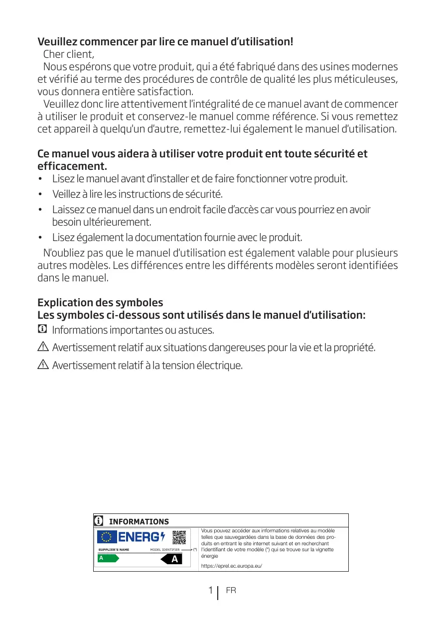 Vous pouvez accéder aux informations relatives au modèle telles que sauvegardées dans la base de données des produits en entrant le site internet suivant et en recherchant l'identifiant de votre modèle (*) qui se trouve sur la vignette énergie https://eprel.ec.europa.eu/