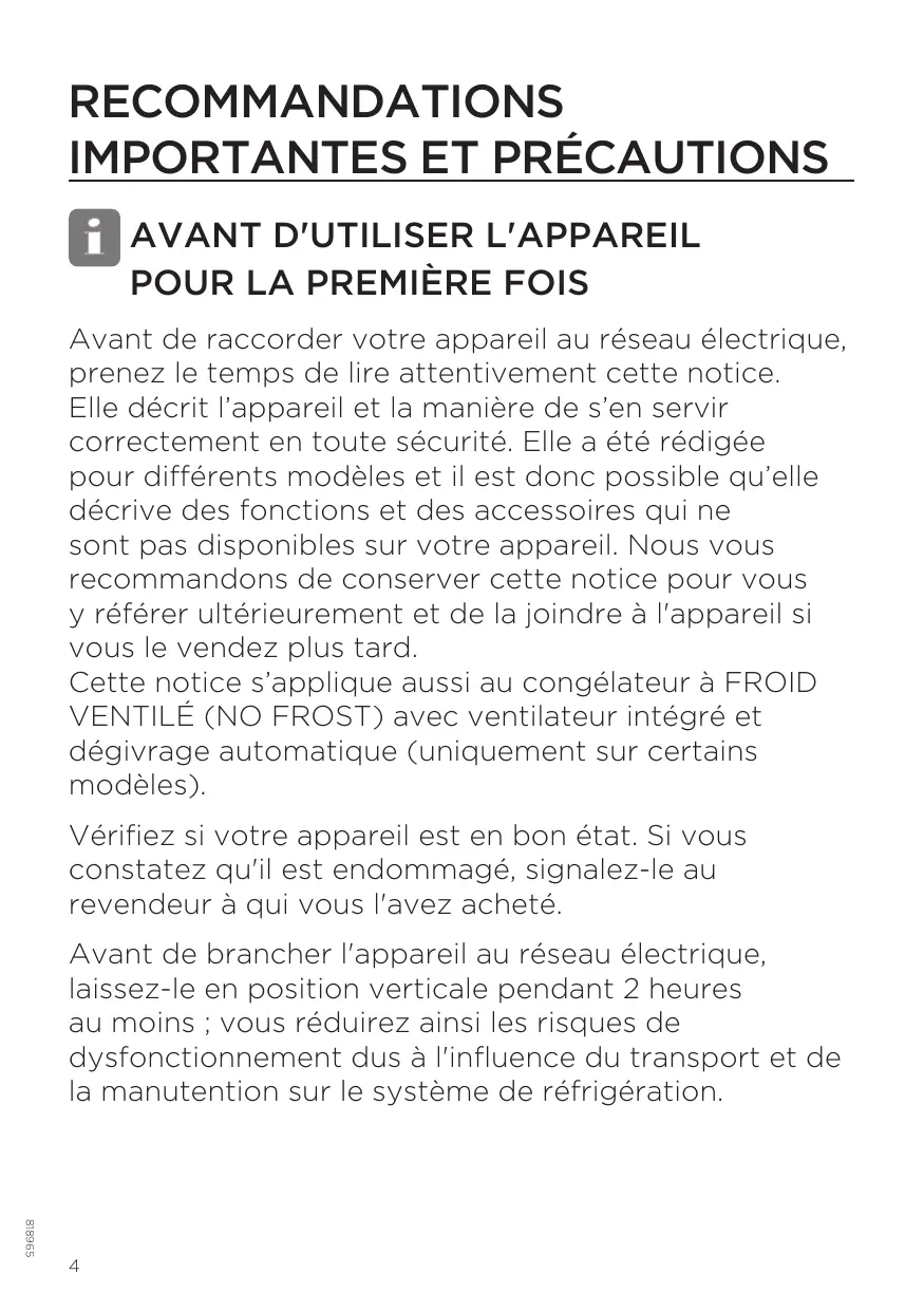Avant de raccorder votre appareil au réseau électrique, prenez le temps de lire attentivement cette notice. Elle décrit l’appareil et la manière de s’en servir correctement en toute sécurité. Elle a été rédigée pour différents modèles et il est donc possible qu’elle décrive des fonctions et des accessoires qui ne sont pas disponibles sur votre appareil. Nous vous recommandons de conserver cette notice pour vous y référer ultérieurement et de la joindre à l'appareil si vous le vendez plus tard. Cette notice s’applique aussi au congélateur à FROID VENTILÉ (NO FROST) avec ventilateur intégré et dégivrage automatique (uniquement sur certains modèles). Vérifiez si votre appareil est en bon état. Si vous constatez qu'il est endommagé, signalez-le au revendeur à qui vous l'avez acheté. Avant de brancher l'appareil au réseau électrique, laissez-le en position verticale pendant 2 heures au moins ; vous réduirez ainsi les risques de dysfonctionnement dus à l'influence du transport et de la manutention sur le système de réfrigération.