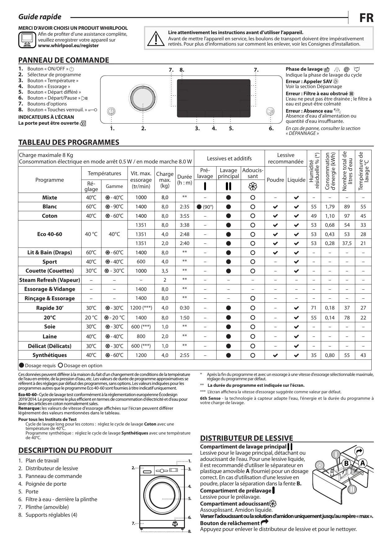 Whirlpool décline toute responsabilité pour les évventuels dommages à l'appareil provoqués par l'utilisation d'autres produits détergents pour machines à laver disponibles sur le marché.