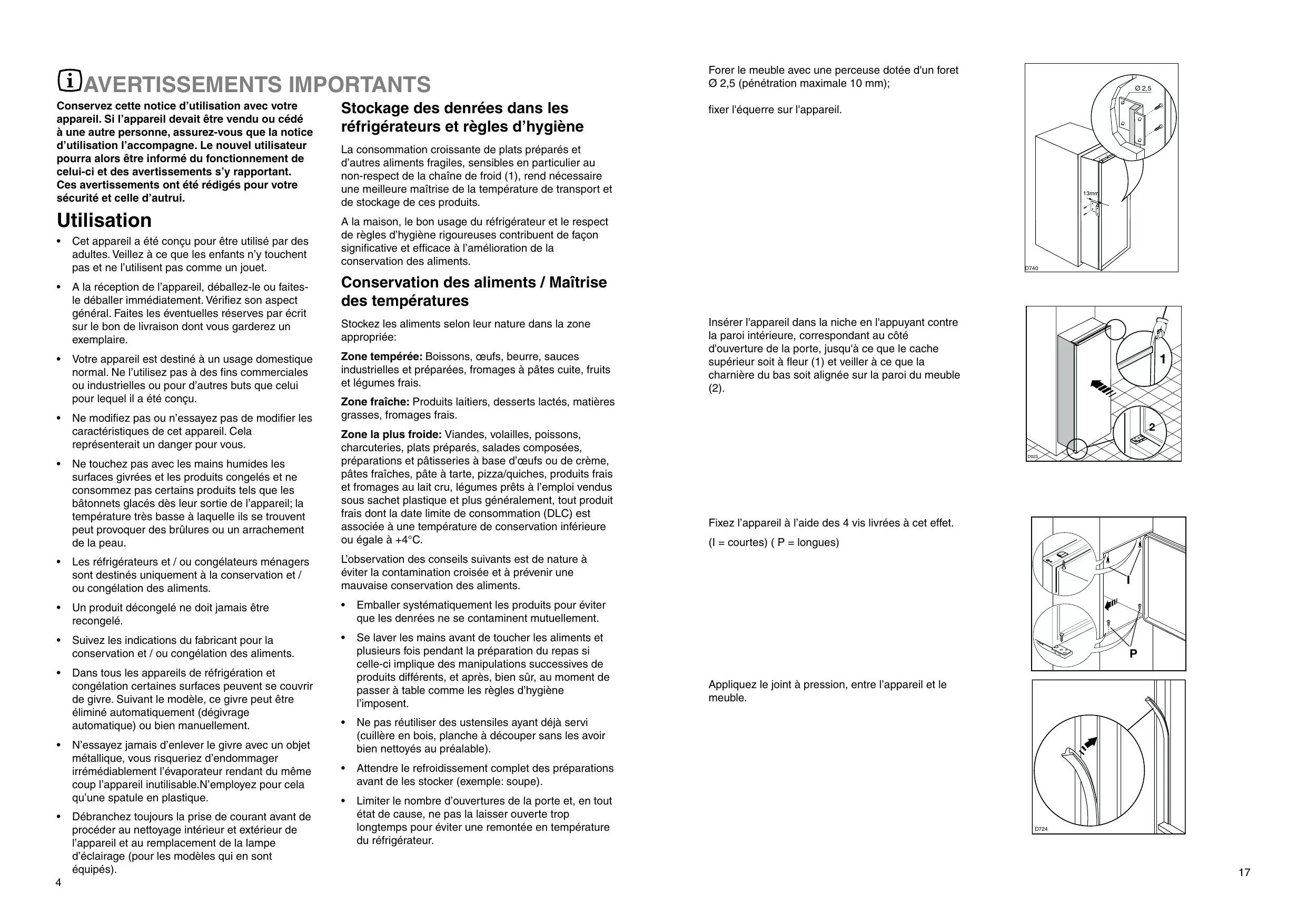 Chaque type d’aliment a une température de conservation idéale et donc un emplacement précis à respecter. En réglant correctement votre réfrigérateur, vous obtiendrez des zones correspondant à chaque type d’aliment (voir chapitre “AVERTISSEMENTS IMPORTANTS”).