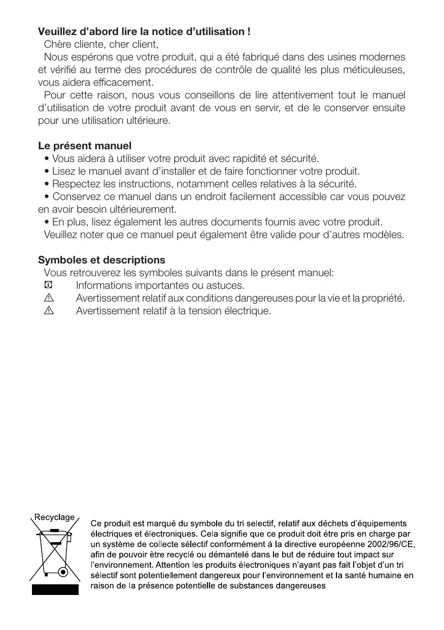 EN Veuillez d’abord lire la notice d’utilisation ! Chère cliente, cher client, Nous espérons que votre produit, qui a été fabriqué dans des usines modernes et vérifié au terme des procédures de contrôle de qualité les plus méticuleuses, vous aidera efficacement. Pour cette raison, nous vous conseillons de lire attentivement tout le manuel d’utilisation de votre produit avant de vous en servir, et de le conserver ensuite pour une utilisation ultérieure. Le présent manuel • Vous aidera à utiliser votre produit avec rapidité et sécurité. • Lisez le manuel avant d’installer et de faire fonctionner votre produit. • Respectez les instructions, notamment celles relatives à la sécurité. • Conservez ce manuel dans un endroit facilement accessible car vous pouvez en avoir besoin ultérieurement. • En plus, lisez également les autres documents fournis avec votre produit. Veuillez noter que ce manuel peut également être valide pour d’autres modèles. Symboles et descriptions Vous retrouverez les symboles suivants dans le présent manuel: C Informations importantes ou astuces. A Avertissement relatif aux conditions dangereuses pour la vie et la propriété. B Avertissement relatif à la tension électrique.