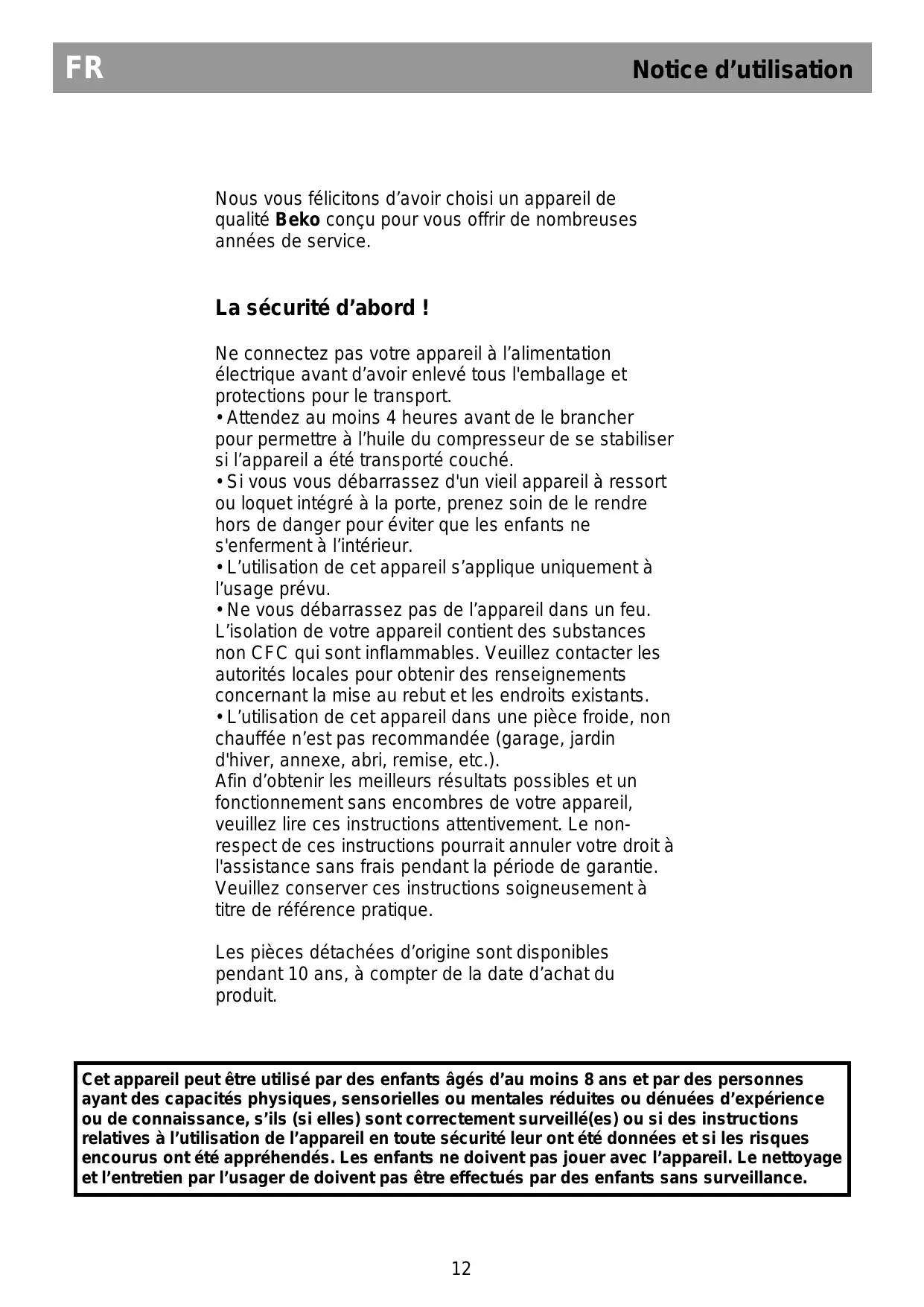 Ne connectez pas votre appareil à l’alimentation électrique avant d’avoir enlevé tous l'emballage et protections pour le transport. • Attendez au moins 4 heures avant de le brancher pour permettre à l’huile du compresseur de se stabiliser si l’appareil a été transporté couché. • Si vous vous débarrassez d'un vieil appareil à ressort ou loquet intégré à la porte, prenez soin de le rendre hors de danger pour éviter que les enfants ne s'enferment à l’intérieur. • L’utilisation de cet appareil s’applique uniquement à l’usage prévu. • Ne vous débarrassez pas de l’appareil dans un feu. L’isolation de votre appareil contient des substances non CFC qui sont inflammables. Veuillez contacter les autorités locales pour obtenir des renseignements concernant la mise au rebut et les endroits existants. • L’utilisation de cet appareil dans une pièce froide, non chauffée n’est pas recommandée (garage, jardin d'hiver, annexe, abri, remise, etc.). Afin d’obtenir les meilleurs résultats possibles et un fonctionnement sans encombres de votre appareil, veuillez lire ces instructions attentivement. Le nonrespect de ces instructions pourrait annuler votre droit à l'assistance sans frais pendant la période de garantie. Veuillez conserver ces instructions soigneusement à titre de référence pratique. Les pièces détachées d’origine sont disponibles pendant 10 ans, à compter de la date d’achat du produit.