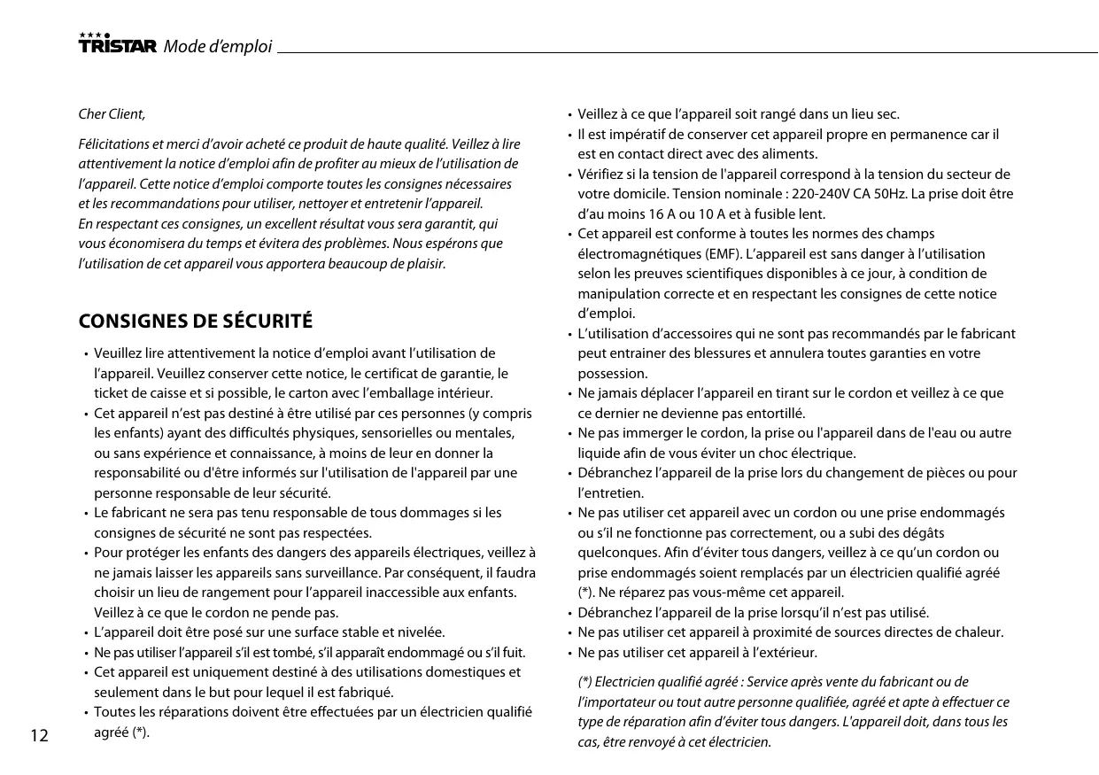 • Tristar n’est pas tenu responsable des dégâts intervenus : o En cas de la chute de l’appareil o En cas de modification technique de l’appareil par le propriétaire ou par un tiers o En cas de mauvaise utilisation de l’appareil o En cas d’usure normale de l’appareil • L’exécution de réparations ne prolongera pas la période originale de garantie de 24 mois, ni ne donnera droit à une nouvelle garantie conforme. Cette garantie n’est légale qu’en Europe. Cette garantie ne change pas la Directive Européenne 1944/44CE. • Conservez toujours votre reçu, il vous sera impossible de faire une réclamation sous garantie sans ce reçu. • Les dommages causés par le non respect de la notice d’emploi, entraineront l’annulation de la garantie, Tristar ne sera pas tenu responsable si des dégâts en résultent.