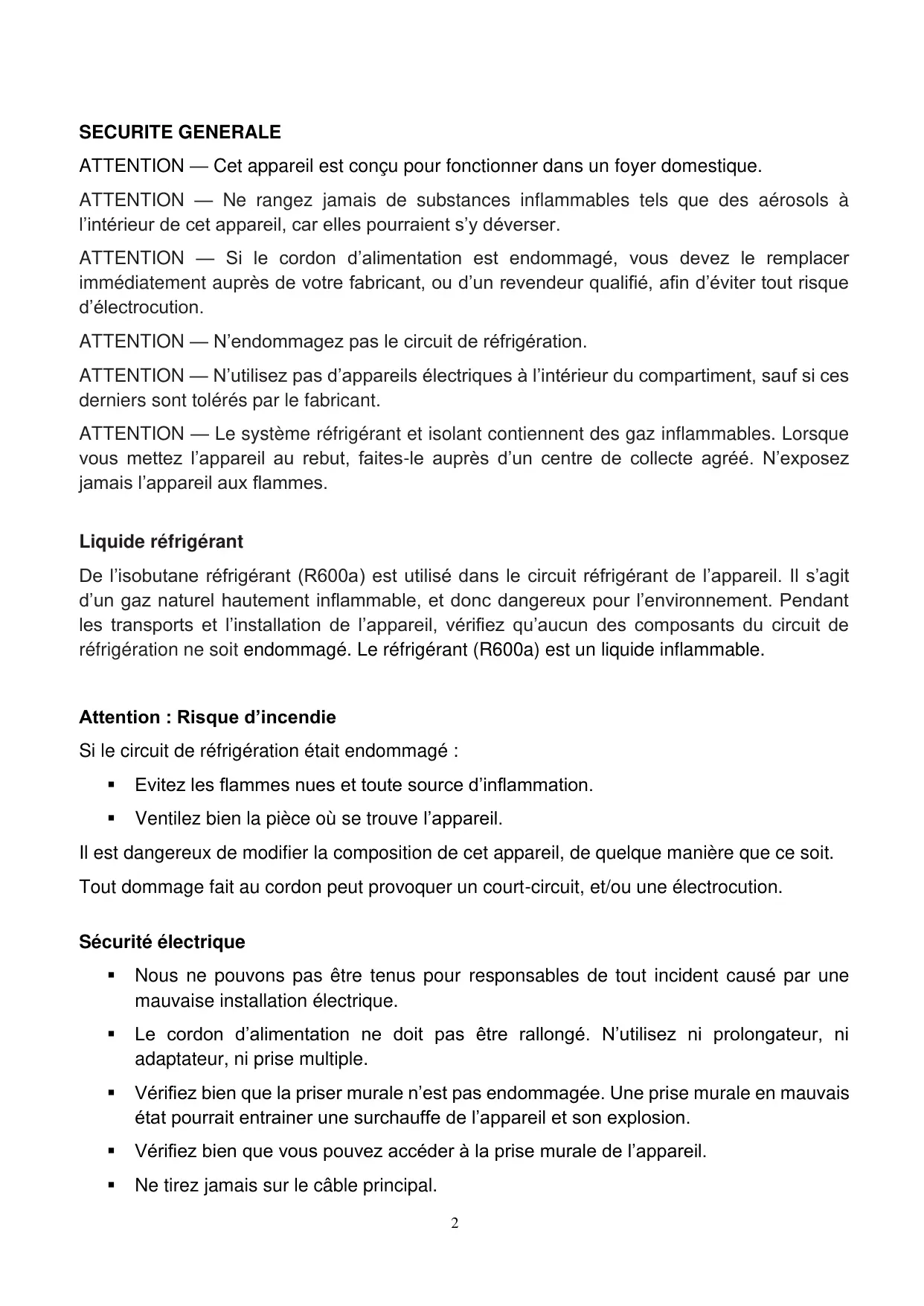 SECURITE GENERALE ATTENTION — Cet appareil est conçu pour fonctionner dans un foyer domestique. ATTENTION — Ne rangez jamais de substances inflammables tels que des aérosols à l'intérieur de cet appareil, car elles pourraient s'y déverser. ATTENTION — Si le cordon d'alimentation est endommagé, vous devez le remplacer immédiatement auprès de votre fabricant, ou d’un revendeur qualifié, afin d’éviter tout risque d'électrocution. ATTENTION — N'endommagez pas le circuit de réfrigération. ATTENTION — N'utilisez pas d'appareils électriques à l’intérieur du compartiment, sauf si ces derniers sont tolérés par le fabricant. ATTENTION — Le système réfrigérant et isolant contiennent des gaz inflammables. Lorsque vous mettez l'appareil au rebut, faites-le auprès d’un centre de collecte agréé. N'exposez jamais l'appareil aux flammes. Liquide réfrigérant De l’isobutane réfrigérant (R600a) est utilisé dans le circuit réfrigérant de l'appareil. Il s’agit d'un gaz naturel hautement inflammable, et donc dangereux pour l’environnement. Pendant les transports et l'installation de l'appareil, vérifiez qu'aucun des composants du circuit de réfrigération ne soit endommagé. Le réfrigérant (R600a) est un liquide inflammable. Attention : Risque d'incendie Si le circuit de réfrigération était endommagé : “ Evitez les flammes nues et toute source d’inflammation. " _Ventilez bien la pièce où se trouve l'appareil. Ilest dangereux de modifier la composition de cet appareil, de quelque manière que ce soit. Tout dommage fait au cordon peut provoquer un court-circuit, et/ou une électrocution. Sécurité électrique " Nous ne pouvons pas être tenus pour responsables de tout incident causé par une mauvaise installation électrique. “" Le cordon d'alimentation ne doit pas être rallongé. N'utilisez ni prolongateur, ni adaptateur, ni prise multiple. "Vérifiez bien que la priser murale n'est pas endommagée. Une prise murale en mauvais état pourrait entrainer une surchauffe de l'appareil et son explosion. "Vérifiez bien que vous pouvez accéder à la prise murale de l'appareil. " Ne tirez jamais sur le câble principal.