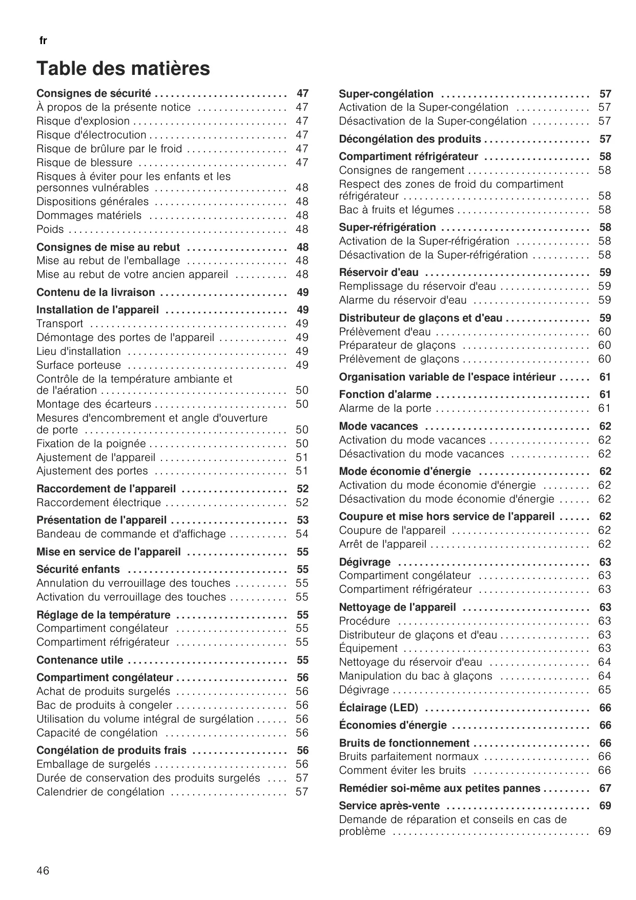 Consignes de mise au rebut . . . . . . . . . . . . . . . . . . . 48 Mise au rebut de l'emballage . . . . . . . . . . . . . . . . . . . 48 Mise au rebut de votre ancien appareil . . . . . . . . . . 48 Contenu de la livraison . . . . . . . . . . . . . . . . . . . . . . . . 49 Installation de l'appareil . . . . . . . . . . . . . . . . . . . . . . . Transport . . . . . . . . . . . . . . . . . . . . . . . . . . . . . . . . . . . . . Démontage des portes de l'appareil . . . . . . . . . . . . . Lieu d'installation . . . . . . . . . . . . . . . . . . . . . . . . . . . . . . Surface porteuse . . . . . . . . . . . . . . . . . . . . . . . . . . . . . . Contrôle de la température ambiante et de l'aération . . . . . . . . . . . . . . . . . . . . . . . . . . . . . . . . . . . Montage des écarteurs . . . . . . . . . . . . . . . . . . . . . . . . . Mesures d'encombrement et angle d'ouverture de porte . . . . . . . . . . . . . . . . . . . . . . . . . . . . . . . . . . . . . . Fixation de la poignée . . . . . . . . . . . . . . . . . . . . . . . . . . Ajustement de l'appareil . . . . . . . . . . . . . . . . . . . . . . . . Ajustement des portes . . . . . . . . . . . . . . . . . . . . . . . . .