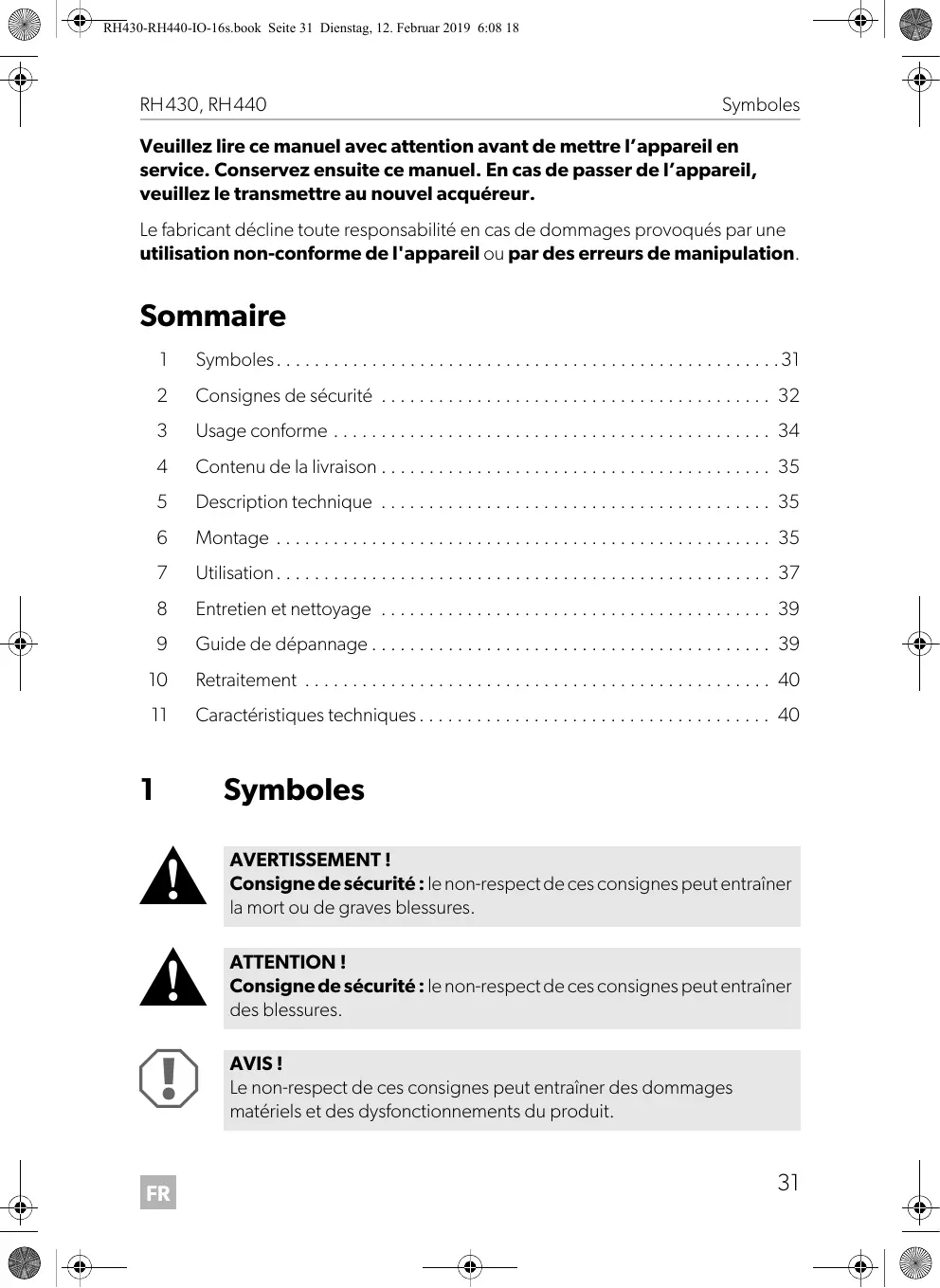 AVERTISSEMENT ! Consigne de sécurité : le non-respect de ces consignes peut entraîner la mort ou de graves blessures. ATTENTION ! Consigne de sécurité : le non-respect de ces consignes peut entraîner des blessures. AVIS ! Le non-respect de ces consignes peut entraîner des dommages matériels et des dysfonctionnements du produit.