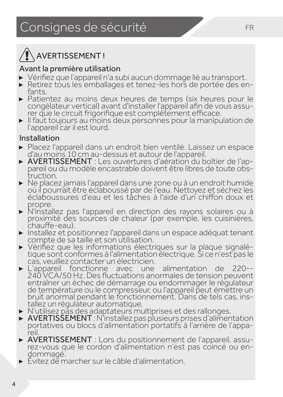 Avant la première utilisation ▶ Vérifiez que l’appareil n’a subi aucun dommage lié au transport. ▶ Retirez tous les emballages et tenez-les hors de portée des enfants. ▶ Patientez au moins deux heures de temps (six heures pour le congélateur vertical) avant d'installer l'appareil afin de vous assurer que le circuit frigorifique est complètement efficace. ▶ Il faut toujours au moins deux personnes pour la manipulation de l’appareil car il est lourd. Installation ▶ Placez l'appareil dans un endroit bien ventilé. Laissez un espace d'au moins 10 cm au-dessus et autour de l'appareil. ▶ AVERTISSEMENT : Les ouvertures d’aération du boîtier de l’appareil ou du modèle encastrable doivent être libres de toute obstruction. ▶ Ne placez jamais l'appareil dans une zone ou à un endroit humide où il pourrait être éclaboussé par de l'eau. Nettoyez et séchez les éclaboussures d'eau et les tâches à l'aide d'un chiffon doux et propre. ▶ N'installez pas l'appareil en direction des rayons solaires ou à proximité des sources de chaleur (par exemple, les cuisinières, chauffe-eau). ▶ Installez et positionnez l'appareil dans un espace adéquat tenant compte de sa taille et son utilisation. ▶ Vérifiez que les informations électriques sur la plaque signalétique sont conformes à l'alimentation électrique. Si ce n'est pas le cas, veuillez contacter un électricien. ▶ L’appareil fonctionne avec une alimentation de 220~240 VCA/50 Hz. Des fluctuations anormales de tension peuvent entraîner un échec de démarrage ou endommager le régulateur de température ou le compresseur, ou l'appareil peut émettre un bruit anormal pendant le fonctionnement. Dans de tels cas, installez un régulateur automatique. ▶ N’utilisez pas des adaptateurs multiprises et des rallonges. ▶ AVERTISSEMENT : N’installez pas plusieurs prises d’alimentation portatives ou blocs d’alimentation portatifs à l’arrière de l’appareil. ▶ AVERTISSEMENT : Lors du positionnement de l’appareil, assurez-vous que le cordon d’alimentation n’est pas coincé ou endommagé. ▶ Évitez de marcher sur le câble d'alimentation. 4