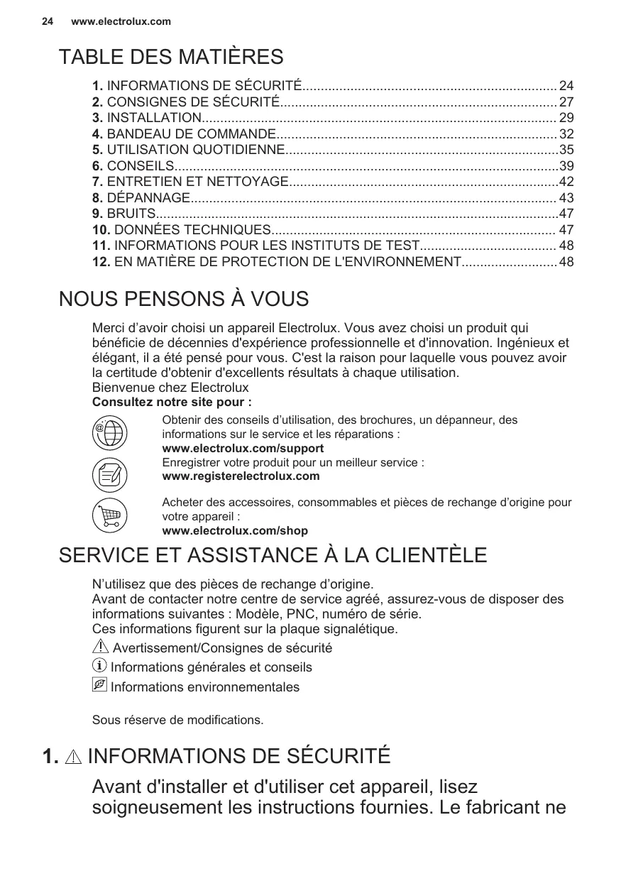 NOUS PENSONS À VOUS Merci d’avoir choisi un appareil Electrolux. Vous avez choisi un produit qui bénéficie de décennies d'expérience professionnelle et d'innovation. Ingénieux et élégant, il a été pensé pour vous. C'est la raison pour laquelle vous pouvez avoir la certitude d'obtenir d'excellents résultats à chaque utilisation. Bienvenue chez Electrolux Consultez notre site pour :