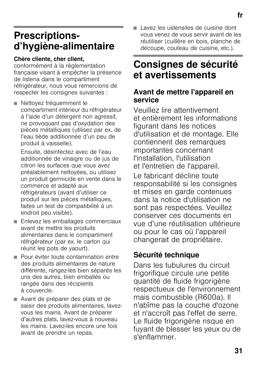 frTable des matièresfrMode d’emploi Prescriptionsd’hygiène-alimentaire Chère cliente, cher client, conformément à la réglementation française visant à empêcher la présence de listeria dans le compartiment réfrigérateur, nous vous remercions de respecter les consignes suivantes :