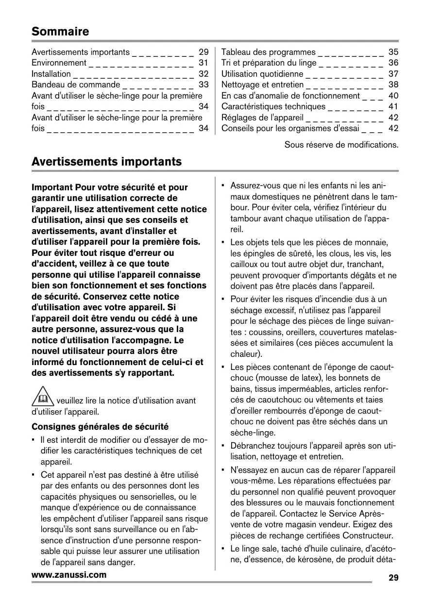 • Avant d'utiliser l'appareil, enlevez tous les éléments de protection de transport. En cas de non-respect de cette recommandation, l'appareil ou les accessoires risquent de subir des dommages importants. Voir le chapitre correspondant dans cette notice d'utilisation. • Si l'installation de votre habitation nécessite une modification pour le branchement de votre appareil, faites appel à un électricien qualifié. • Si l'appareil est placé sur une moquette, ajustez les pieds afin de permettre à l'air de circuler librement sous l'appareil. • Veillez à ne pas endommager la fiche secteur ni le câble d'alimentation. • Si le sèche-linge est placé au-dessus d'un lave-linge, utilisez le kit de superposition (accessoire en option). Usage prévu • Cet appareil est destiné à un usage particulier. Ne l'utilisez pas à des fins commerciales ou industrielles ou pour d'autres buts que celui pour lequel il a été conçu. • Ne séchez en machine que les articles pouvant supporter ce traitement. Suivez les indications se trouvant sur l'étiquette dont chaque article est muni. • N'introduisez dans le sèche-linge que du linge propre. • Ne surchargez pas l'appareil. Voir le chapitre correspondant dans cette notice d'utilisation. • Ne placez pas de linge non essoré dans le sèche-linge. • Ne séchez pas en machine les articles entrés en contact avec des détachants volatiles. Si de tels détachants sont utilisés avant le lavawww.zanussi.com