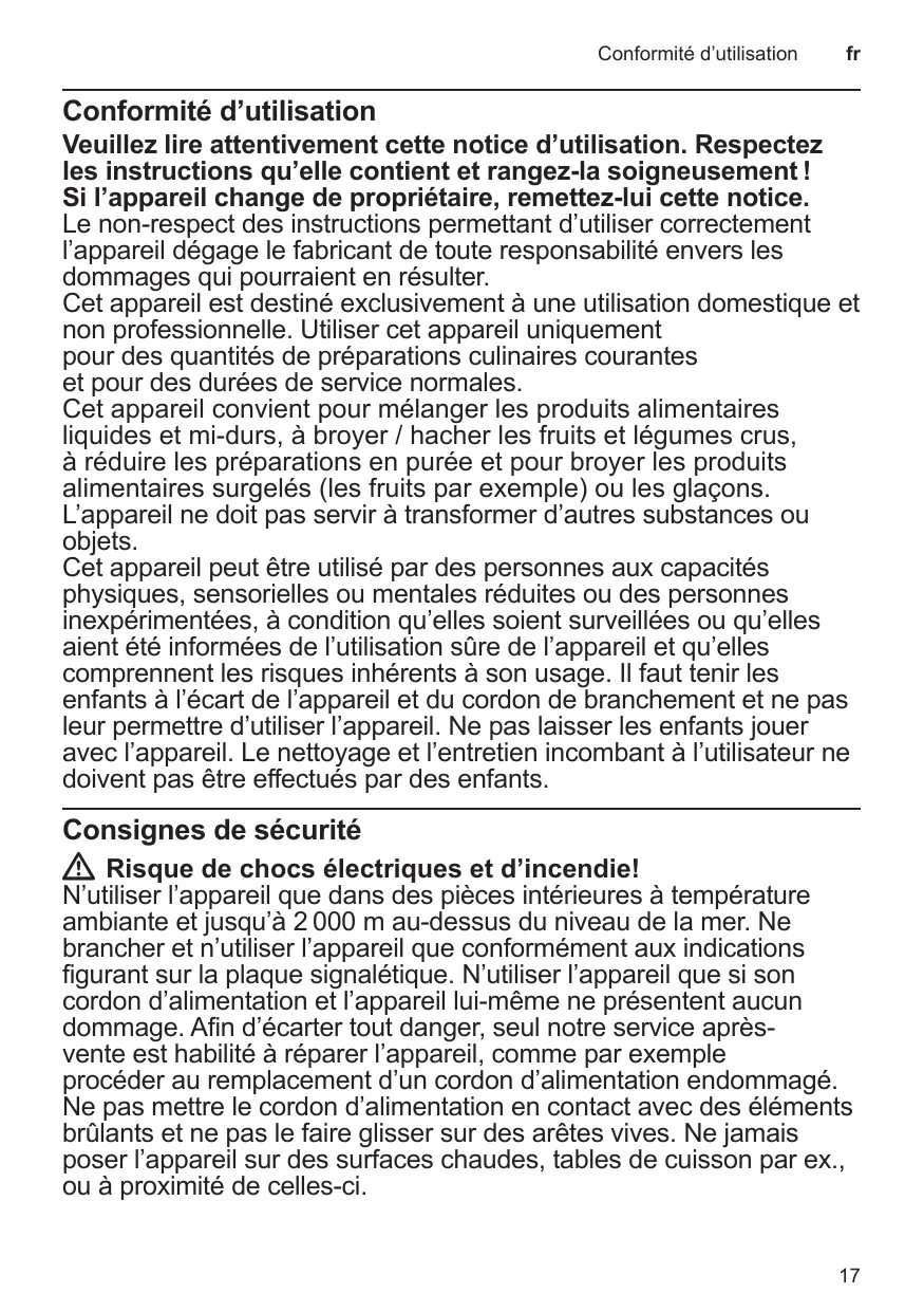 Veuillez lire attentivement cette notice d’utilisation. Respectez les instructions qu’elle contient et rangez-la soigneusement ! Si l’appareil change de propriétaire, remettez-lui cette notice. Le non-respect des instructions permettant d’utiliser correctement l’appareil dégage le fabricant de toute responsabilité envers les dommages qui pourraient en résulter. Cet appareil est destiné exclusivement à une utilisation domestique et non professionnelle. Utiliser cet appareil uniquement pour des quantités de préparations culinaires courantes et pour des durées de service normales. Cet appareil convient pour mélanger les produits alimentaires liquides et mi-durs, à broyer / hacher les fruits et légumes crus, à réduire les préparations en purée et pour broyer les produits alimentaires surgelés (les fruits par exemple) ou les glaçons. L’appareil ne doit pas servir à transformer d’autres substances ou objets. Cet appareil peut être utilisé par des personnes aux capacités physiques, sensorielles ou mentales réduites ou des personnes inexpérimentées, à condition qu’elles soient surveillées ou qu’elles aient été informées de l’utilisation sûre de l’appareil et qu’elles comprennent les risques inhérents à son usage. Il faut tenir les enfants à l’écart de l’appareil et du cordon de branchement et ne pas leur permettre d’utiliser l’appareil. Ne pas laisser les enfants jouer avec l’appareil. Le nettoyage et l’entretien incombant à l’utilisateur ne doivent pas être effectués par des enfants.