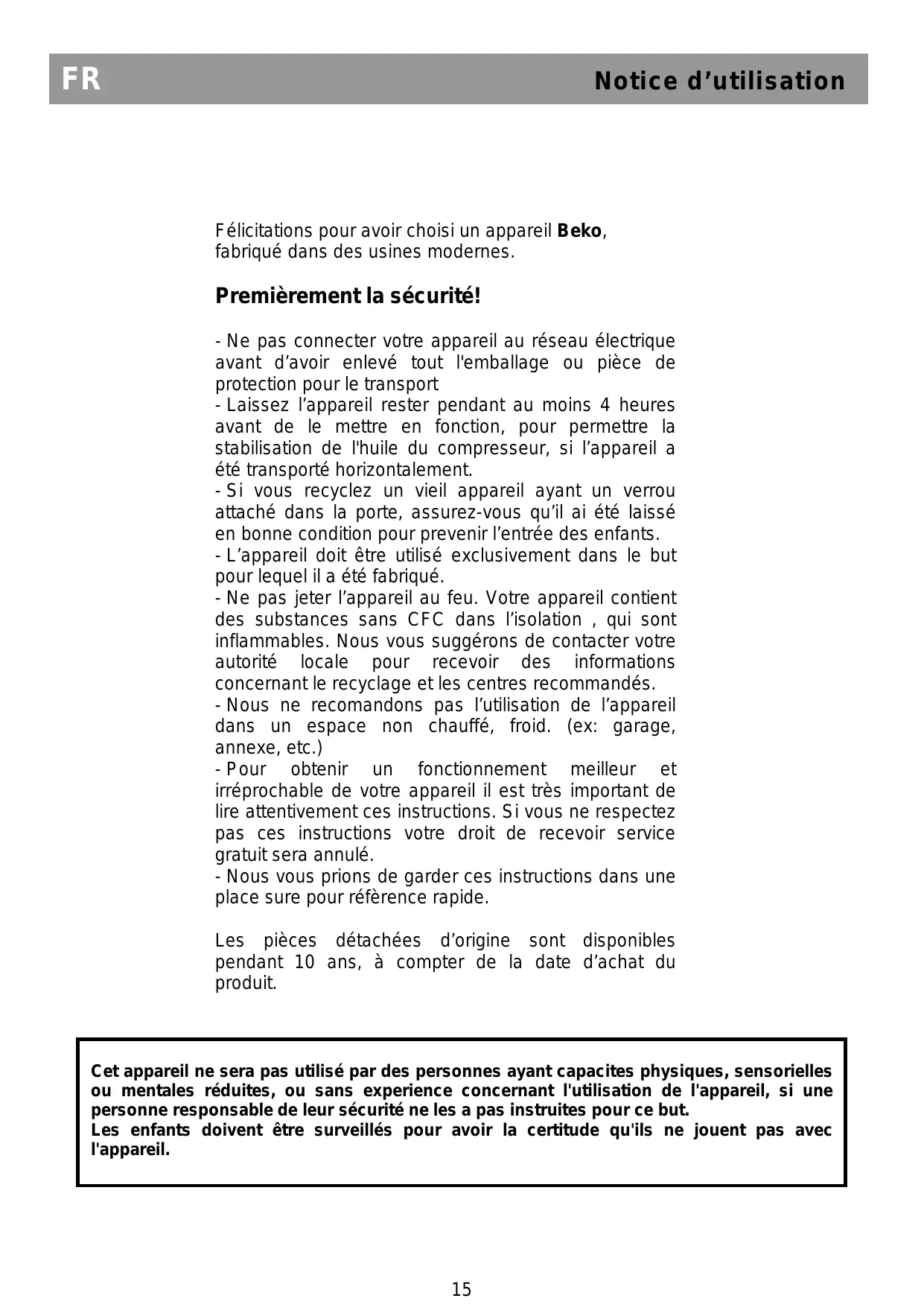 Cet appareil ne sera pas utilisé par des personnes ayant capacites physiques, sensorielles ou mentales réduites, ou sans experience concernant l'utilisation de l'appareil, si une personne responsable de leur sécurité ne les a pas instruites pour ce but.