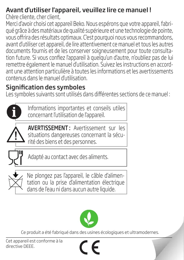Chère cliente, cher client, Merci d’avoir choisi cet appareil Beko. Nous espérons que votre appareil, fabriqué grâce à des matériaux de qualité supérieure et une technologie de pointe, vous offrira des résultats optimaux. C’est pourquoi nous vous recommandons, avant d’utiliser cet appareil, de lire attentivement ce manuel et tous les autres documents fournis et de les conserver soigneusement pour toute consultation future. Si vous confiez l'appareil à quelqu’un d’autre, n’oubliez pas de lui remettre également le manuel d’utilisation. Suivez les instructions en accordant une attention particulière à toutes les informations et les avertissements contenus dans le manuel d’utilisation. Signification des symboles Les symboles suivants sont utilisés dans différentes sections de ce manuel : Informations importantes et conseils utiles concernant l’utilisation de l’appareil. AVERTISSEMENT : Avertissement sur les situations dangereuses concernant la sécurité des biens et des personnes. Adapté au contact avec des aliments. Ne plongez pas l’appareil, le câble d’alimentation ou la prise d’alimentation électrique dans de l’eau ni dans aucun autre liquide.
