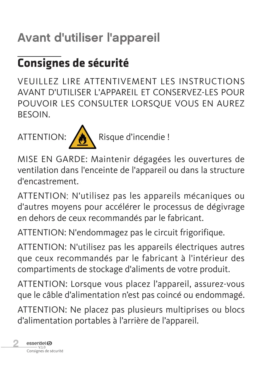 ATTENTION: N'utilisez pas les appareils mécaniques ou d'autres moyens pour accélérer le processus de dégivrage en dehors de ceux recommandés par le fabricant. ATTENTION: N'endommagez pas le circuit frigorifique. ATTENTION: N'utilisez pas les appareils électriques autres que ceux recommandés par le fabricant à l'intérieur des compartiments de stockage d'aliments de votre produit. ATTENTION: Lorsque vous placez l’appareil, assurez-vous que le câble d’alimentation n’est pas coincé ou endommagé. ATTENTION: Ne placez pas plusieurs multiprises ou blocs d’alimentation portables à l’arrière de l’appareil.