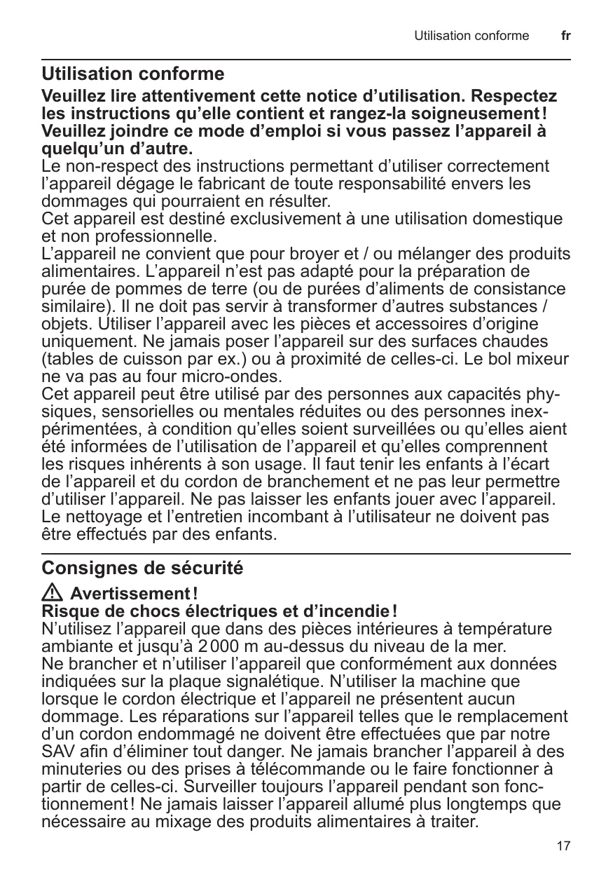 W Avertissement ! Risque de chocs électriques et d’incendie ! N’utilisez l’appareil que dans des pièces intérieures à température ambiante et jusqu’à 2 000 m au-dessus du niveau de la mer. Ne brancher et n’utiliser l’appareil que conformément aux données indiquées sur la plaque signalétique. N’utiliser la machine que lorsque le cordon électrique et l’appareil ne présentent aucun dommage. Les réparations sur l’appareil telles que le remplacement d’un cordon endommagé ne doivent être effectuées que par notre SAV afin d’éliminer tout danger. Ne jamais brancher l’appareil à des minuteries ou des prises à télécommande ou le faire fonctionner à partir de celles-ci. Surveiller toujours l’appareil pendant son fonctionnement ! Ne jamais laisser l’appareil allumé plus longtemps que nécessaire au mixage des produits alimentaires à traiter. 17