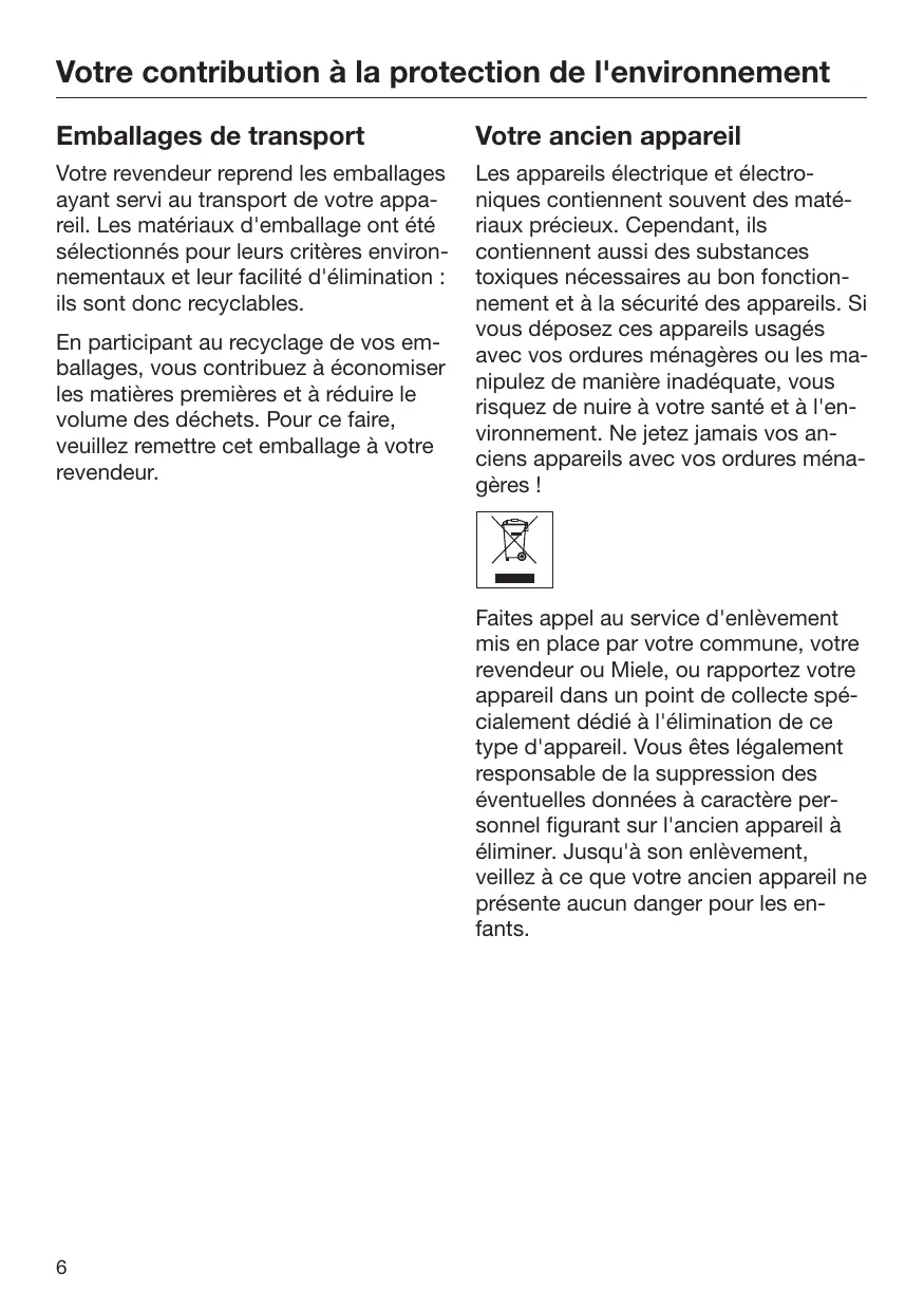 Faites appel au service d'enlèvement mis en place par votre commune, votre revendeur où Miele, ou rapportez votre appareil dans un point de collecte spé- cialement dédié à l'élimination de ce type d'appareil. Vous êtes légalement responsable de la suppression des éventuelles données à caractère per- sonnel figurant sur l'ancien appareil à éliminer. Jusqu'à son enlèvement, veillez à ce que votre ancien appareil ne présente aucun danger pour les en- fants.