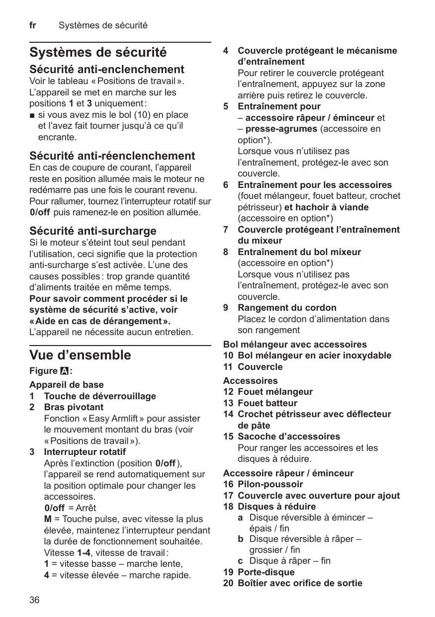 10 Bol mélangeur en acier inoxydable 11 Couvercle Accessoires 12 Fouet mélangeur 13 Fouet batteur 14 Crochet pétrisseur avec déflecteur de pâte 15 Sacoche d’accessoires Pour ranger les accessoires et les disques à réduire. Accessoire râpeur / éminceur 16 Pilon-poussoir 17 Couvercle avec ouverture pour ajout 18 Disques à réduire a Disque réversible à émincer – épais / fin b Disque réversible à râper – grossier / fin c Disque à râper – fin 19 Porte-disque 20 Boîtier avec orifice de sortie