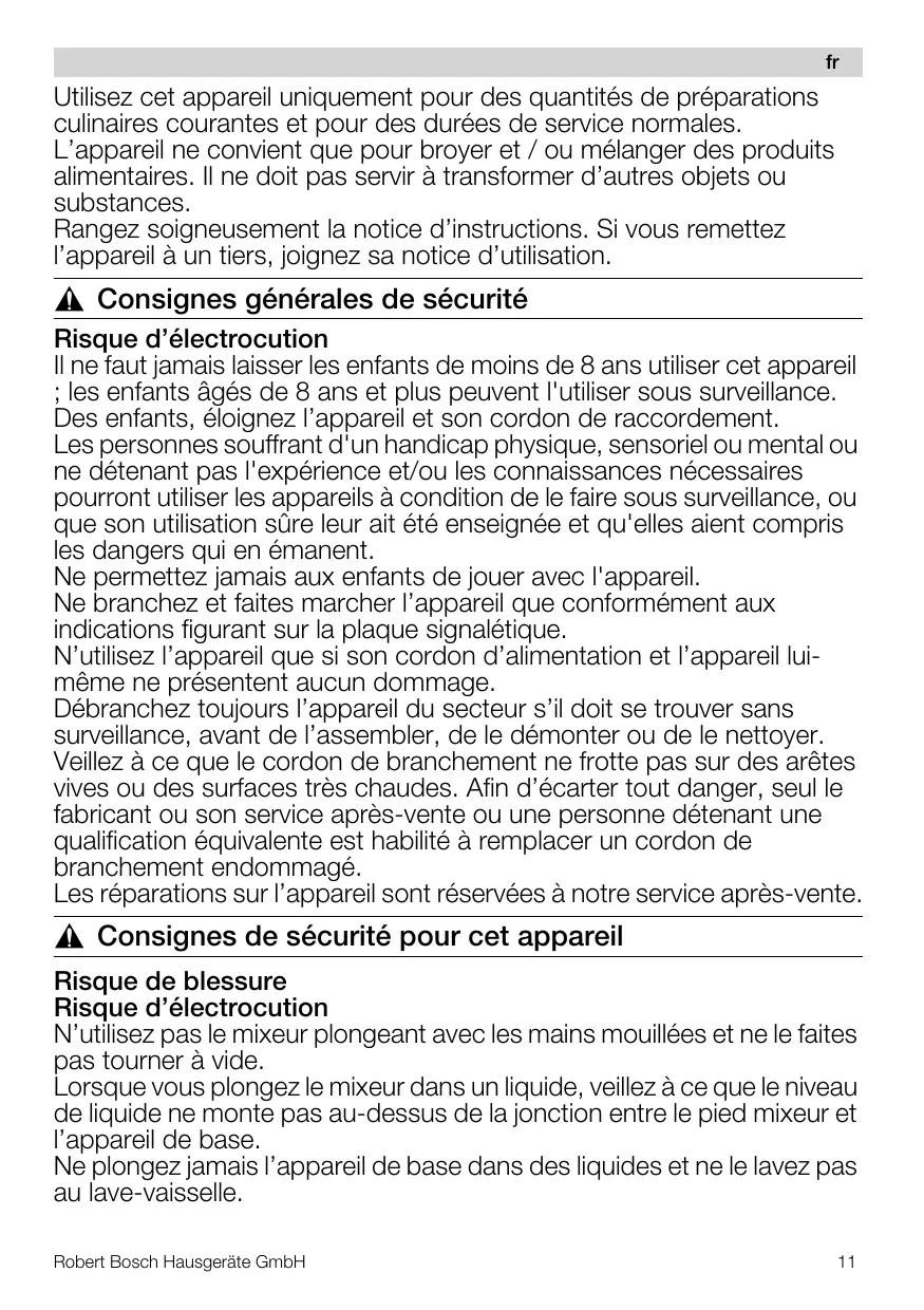 Lorsque vous plongez le mixeur dans un liquide, veillez à ce que le niveau de liquide ne monte pas au-dessus de la jonction entre le pied mixeur et l'appareil de base.