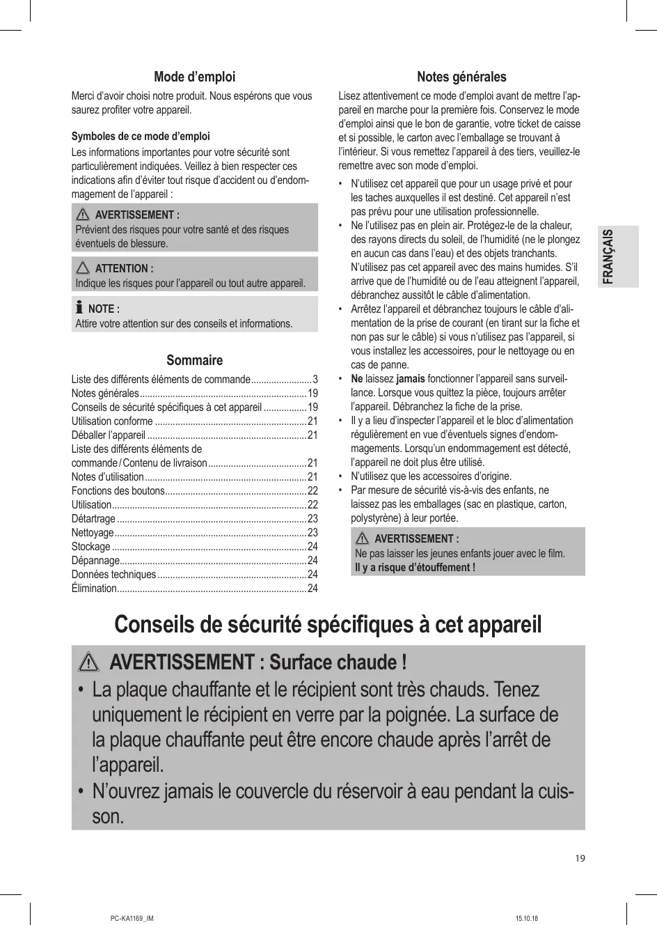 Liste des différents éléments de commande3 Notes générales19 Conseils de sécurité spécifiques à cet appareil19 Utilisation conforme21 Déballer l’appareil21 Liste des différents éléments de commande / Contenu de livraison21 Notes d’utilisation21 Fonctions des boutons22 Utilisation22 Détartrage23 Nettoyage23 Stockage24 Dépannage24 Données techniques24 Élimination24