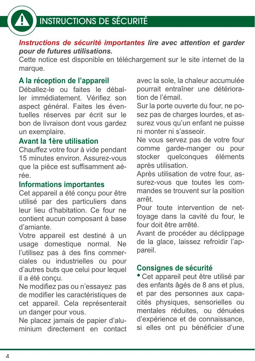 Instructions de sécurité importantes lire avec attention et garder pour de futures utilisations. Cette notice est disponible en téléchargement sur le site internet de la marque. A la réception de l’appareil Déballez-le ou faites le déballer immédiatement. Vérifiez son aspect général. Faites les éventuelles réserves par écrit sur le bon de livraison dont vous gardez un exemplaire. Avant la 1ère utilisation Chauffez votre four à vide pendant 15 minutes environ. Assurez-vous que la pièce est suffisamment aérée. Informations importantes Cet appareil a été conçu pour être utilisé par des particuliers dans leur lieu d’habitation. Ce four ne contient aucun composant à base d’amiante. Votre appareil est destiné à un usage domestique normal. Ne l’utilisez pas à des fins commerciales ou industrielles ou pour d’autres buts que celui pour lequel il a été conçu. Ne modifiez pas ou n’essayez pas de modifier les caractéristiques de cet appareil. Cela représenterait un danger pour vous. Ne placez jamais de papier d’aluminium directement en contact