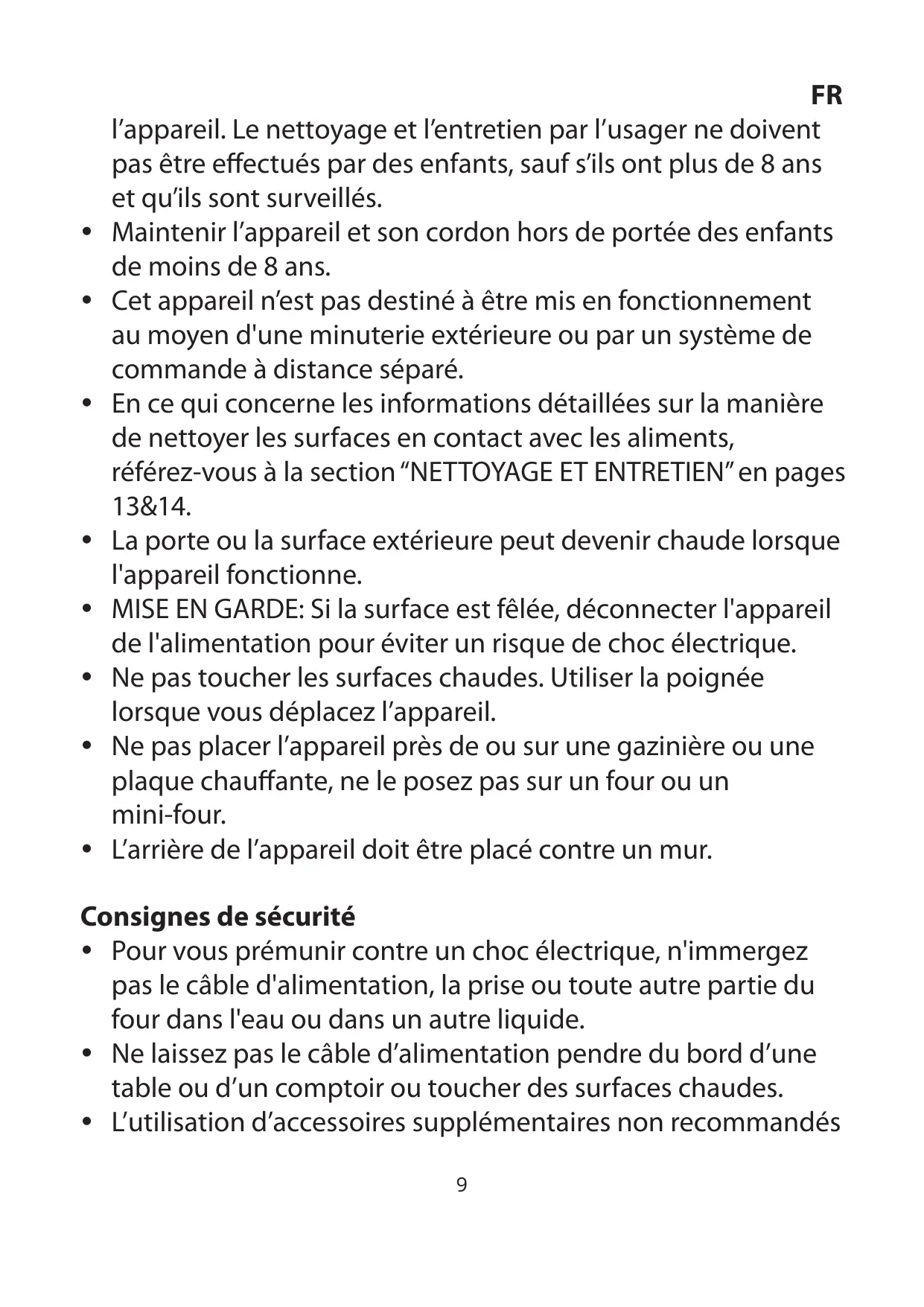 FR l’appareil. Le nettoyage et l’entretien par l’usager ne doivent pas être effectués par des enfants, sauf s’ils ont plus de 8 ans et qu’ils sont surveillés. Maintenir l’appareil et son cordon hors de portée des enfants de moins de 8 ans. Cet appareil n’est pas destiné à être mis en fonctionnement au moyen d'une minuterie extérieure ou par un système de commande à distance séparé. En ce qui concerne les informations détaillées sur la manière de nettoyer les surfaces en contact avec les aliments, référez-vous à la section “NETTOYAGE ET ENTRETIEN” en pages 13&14. La porte ou la surface extérieure peut devenir chaude lorsque l'appareil fonctionne. MISE EN GARDE: Si la surface est fêlée, déconnecter l'appareil de l'alimentation pour éviter un risque de choc électrique. Ne pas toucher les surfaces chaudes. Utiliser la poignée lorsque vous déplacez l’appareil. Ne pas placer l’appareil près de ou sur une gazinière ou une plaque chauffante, ne le posez pas sur un four ou un mini-four. L’arrière de l’appareil doit être placé contre un mur.