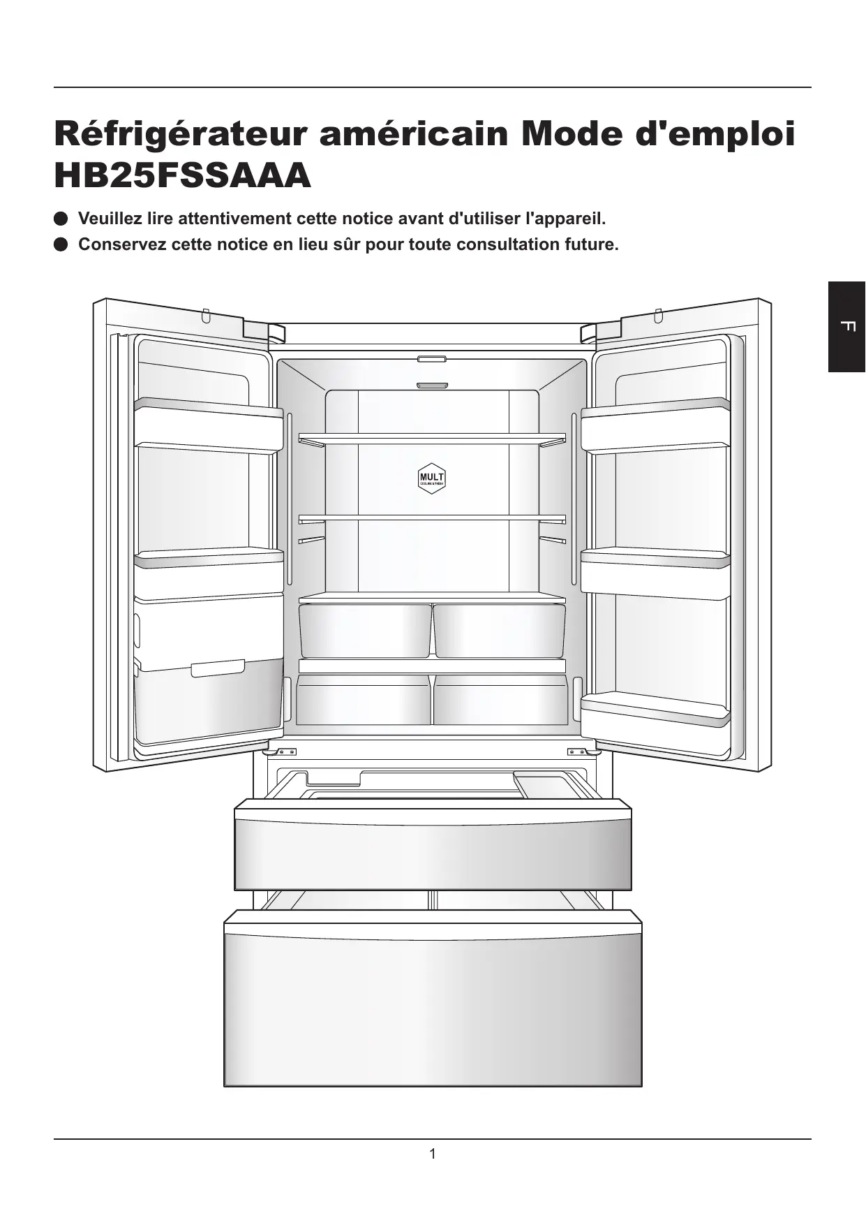 Félicitations ! Nous vous remercions d'avoir acheté un produit Haier . HB25FSSAAA est un réfrigérateur américain 4 portes à la pointe de de la technologie . Veuillez lire attentivement cette notice pour utiliser votre appareil en toute sécurité. Il est notamment indispensable de lire attentivement toutes les consignes de sécurité avant d'utiliser votre appareil.