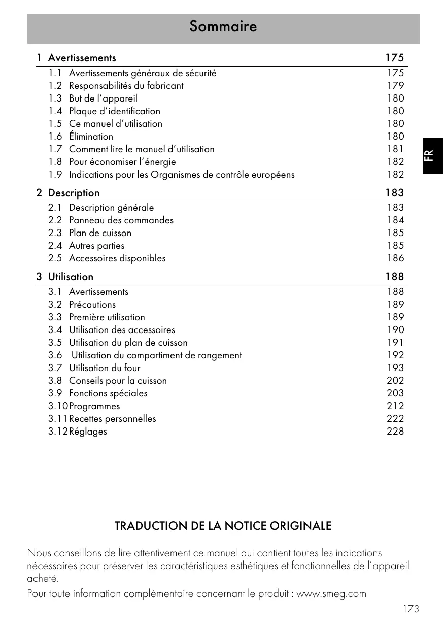 être réalisé par un technicien autorisé. • La mise à la terre est obligatoire selon les modalités prévues par les normes de sécurité de l’installation électrique. • Utilisez des câbles résistant à une température d’au moins 90 °C. • Le couple de serrage des vis des conducteurs d’alimentation du bornier doit être égal à 1,52 Nm. Pour cet appareil • Avant de remplacer la lampe, assurez-vous que l’appareil est hors tension. • Ne vous appuyez pas et ne vous asseyez pas sur la porte ouverte de l’appareil. • Vérifiez qu’aucun objet ne reste coincé dans la porte du four. 1.2 Responsabilités du fabricant Le fabricant décline toute responsabilité en cas de dommages subis par les personnes et les biens, causés par : • l’utilisation de l’appareil différente de celle prévue ; • le non-respect des prescriptions du manuel d’instructions ; • l’altération même d’une seule partie de l’appareil ; • l’utilisation de pièces 179