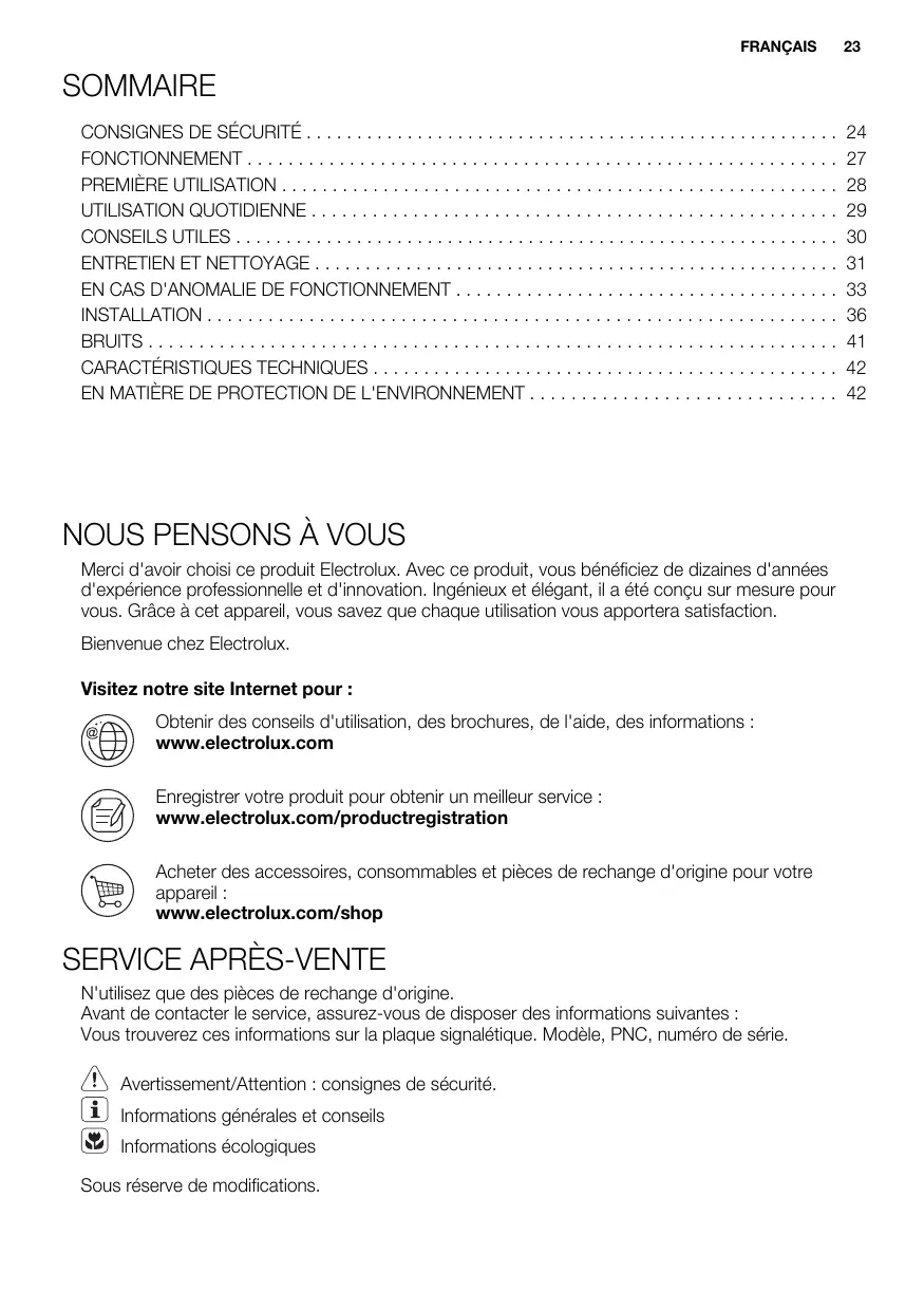 NOUS PENSONS À VOUS Merci d'avoir choisi ce produit Electrolux. Avec ce produit, vous bénéficiez de dizaines d'années d'expérience professionnelle et d'innovation. Ingénieux et élégant, il a été conçu sur mesure pour vous. Grâce à cet appareil, vous savez que chaque utilisation vous apportera satisfaction. Bienvenue chez Electrolux. Visitez notre site Internet pour : Obtenir des conseils d'utilisation, des brochures, de l'aide, des informations : www.electrolux.com Enregistrer votre produit pour obtenir un meilleur service : www.electrolux.com/productregistration Acheter des accessoires, consommables et pièces de rechange d'origine pour votre appareil : www.electrolux.com/shop