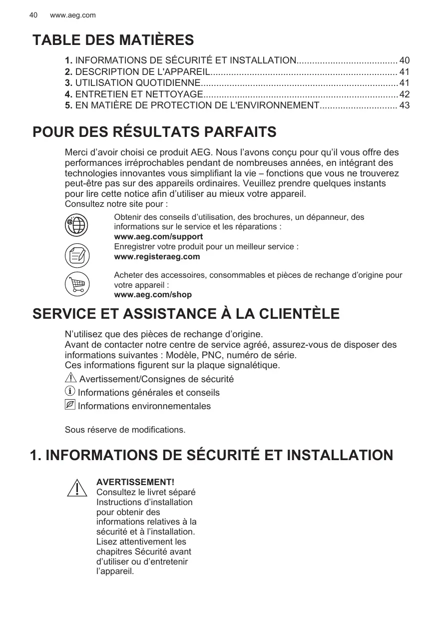 POUR DES RÉSULTATS PARFAITS Merci d’avoir choisi ce produit AEG. Nous l’avons conçu pour qu’il vous offre des performances irréprochables pendant de nombreuses années, en intégrant des technologies innovantes vous simplifiant la vie – fonctions que vous ne trouverez peut-être pas sur des appareils ordinaires. Veuillez prendre quelques instants pour lire cette notice afin d’utiliser au mieux votre appareil.