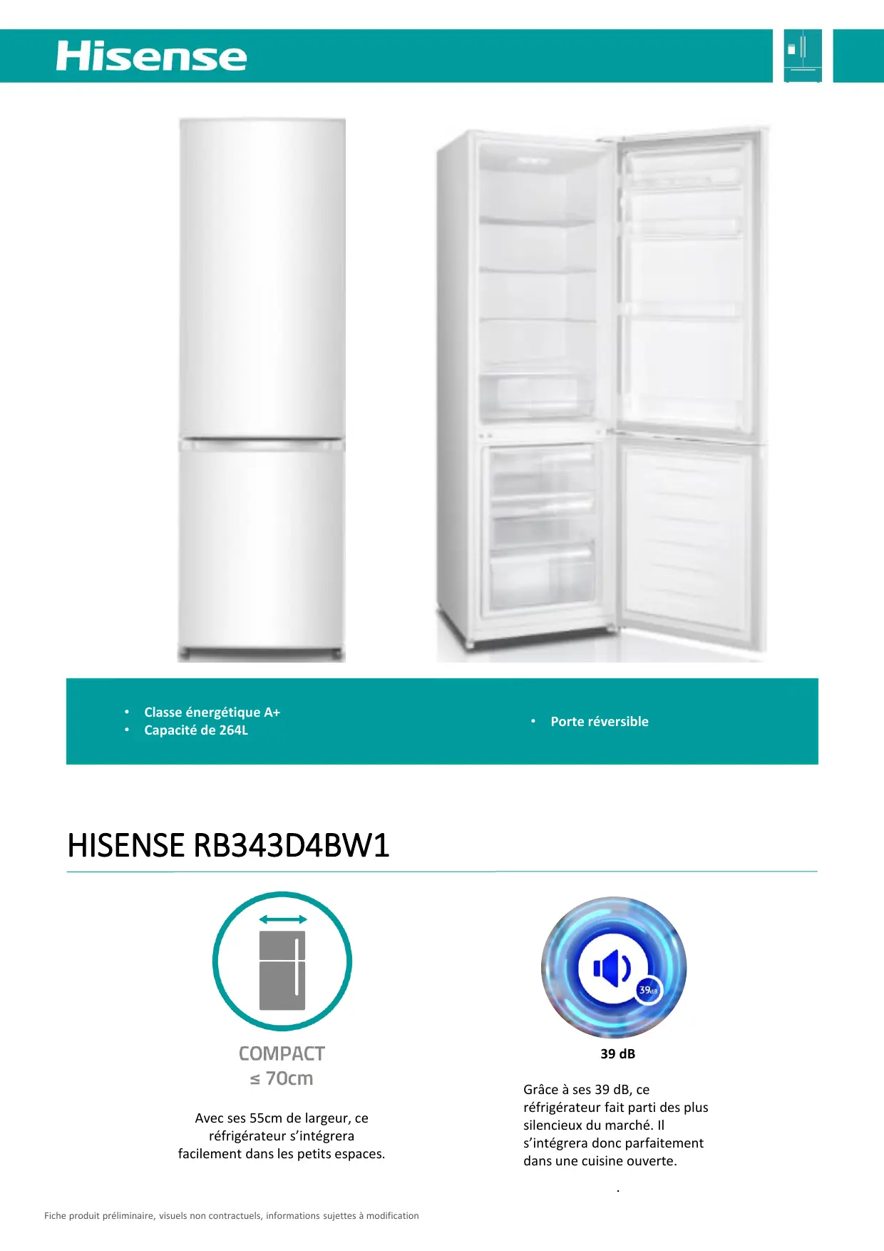 39 dB Avec ses 55cm de largeur, ce réfrigérateur s’intégrera facilement dans les petits espaces. Grâce à ses 39 dB, ce réfrigérateur fait parti des plus silencieux du marché. Il s’intégrera donc parfaitement dans une cuisine ouverte.