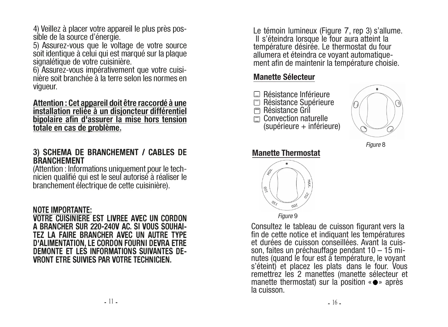 VOTRE CUISINIERE EST LIVREE AVEC UN CORDON A BRANCHER SUR 220-240V AC. SI VOUS SOUHAITEZ LA FAIRE BRANCHER AVEC UN AUTRE TYPE D'ALIMENTATION, LE CORDON FOURNI DEVRA ETRE DEMONTE ET LES INFORMATIONS SUIVANTES DEVRONT ETRE SUIVIES PAR VOTRE TECHNICIEN.