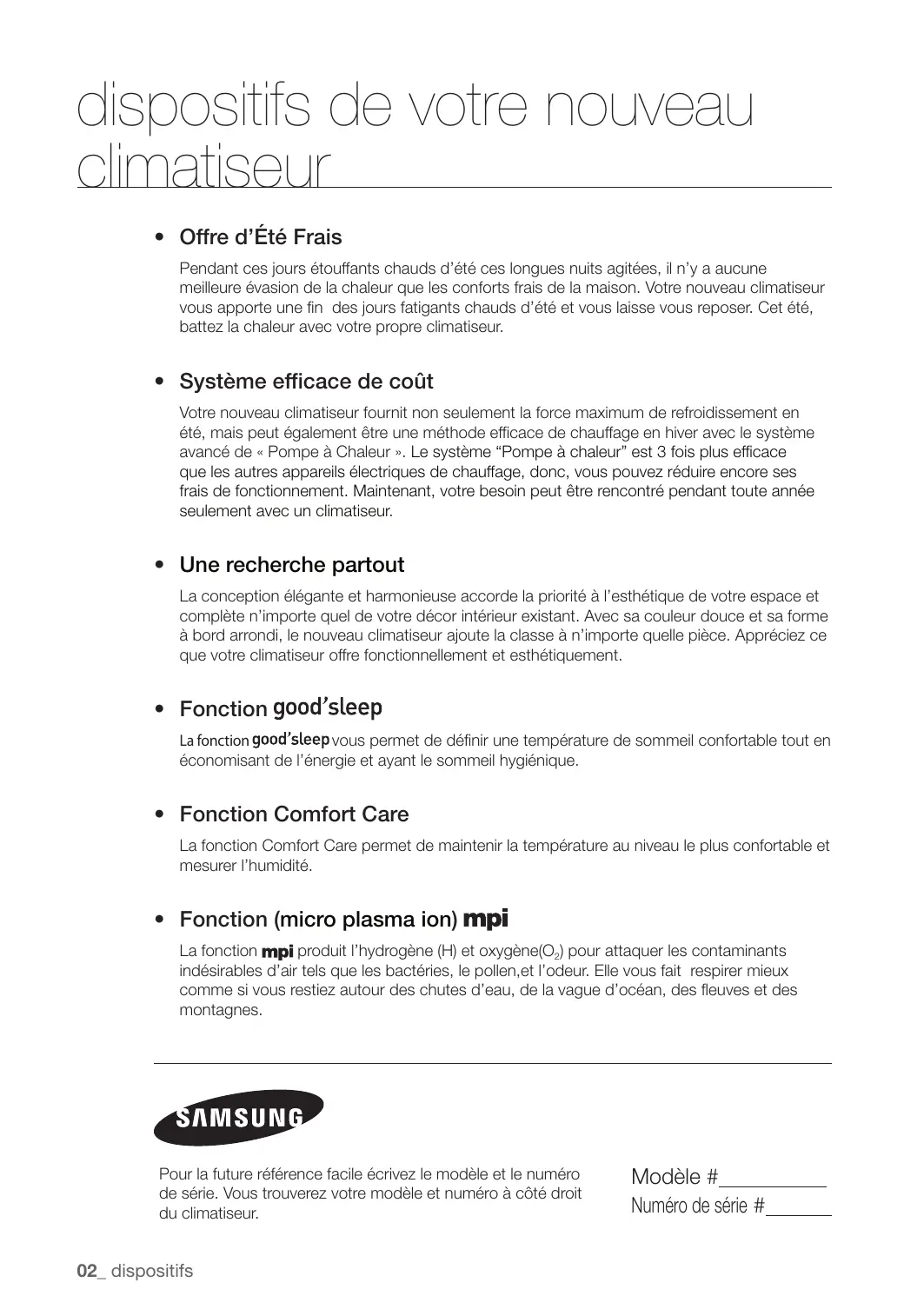 - Fonction (micro plasma ion) La fonction produit l’hydrogène (H) et oxygène(O2) pour attaquer les contaminants indésirables d’air tels que les bactéries, le pollen,et l’odeur. Elle vous fait respirer mieux comme si vous restiez autour des chutes d’eau, de la vague d’océan, des fleuves et des montagnes. Pour la future référence facile écrivez le modèle et le numéro de série. Vous trouverez votre modèle et numéro à côté droit du climatiseur. 02_ dispositifs Modèle # Numéro de série # information de sûreté Pour empêcher la décharge électrique, débranchez le courant avant d’entretenir, nettoyer, et installer l’unité.