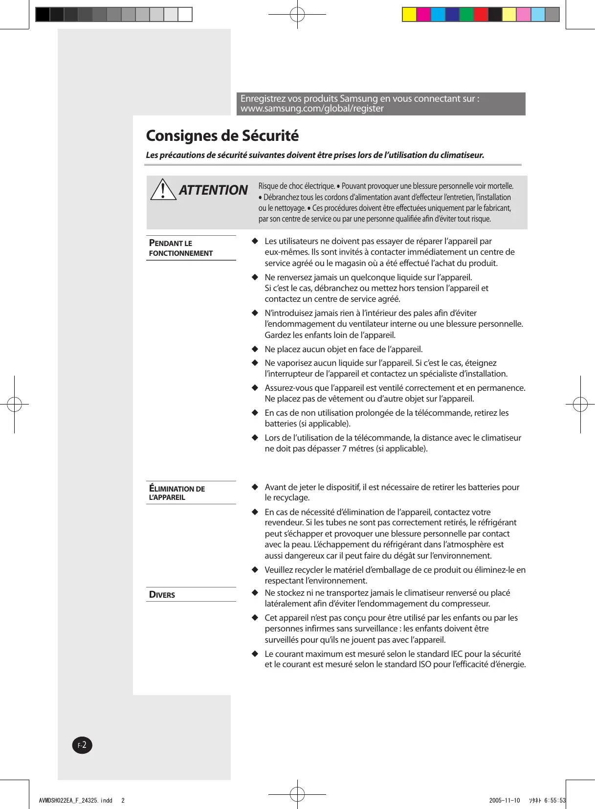 2005-11-10 ソタネト 6:55:37 Enregistrez vos produits Samsung en vous connectant sur : www.samsung.com/global/register Consignes de Sécurité Les précautions de sécurité suivantes doivent être prises lors de l’utilisation du climatiseur. ATTENTION PENDANT LE FONCTIONNEMENT Risque de choc électrique. • Pouvant provoquer une blessure personnelle voir mortelle.