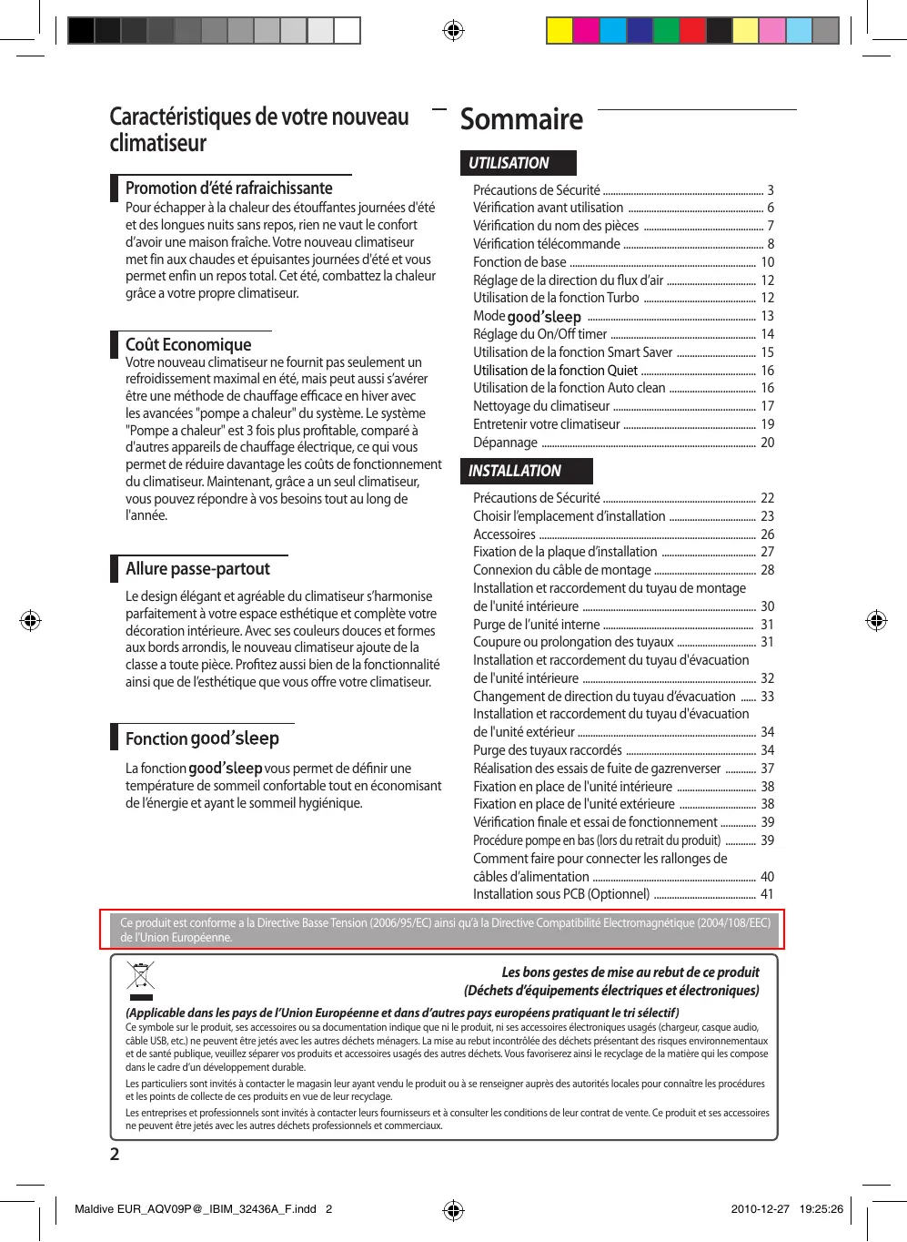- Maldive EUR_AQV09P@_IBIM_32436A_F.indd 1 2010-12-27 19:25:25 Caractéristiques de votre nouveau climatiseur Promotion d’été rafraichissante Pour échapper à la chaleur des étouffantes journées d'été et des longues nuits sans repos, rien ne vaut le confort d’avoir une maison fraîche. Votre nouveau climatiseur met fin aux chaudes et épuisantes journées d'été et vous permet enfin un repos total. Cet été, combattez la chaleur grâce a votre propre climatiseur. Coût Economique Votre nouveau climatiseur ne fournit pas seulement un refroidissement maximal en été, mais peut aussi s’avérer être une méthode de chauffage efficace en hiver avec les avancées "pompe a chaleur" du système. Le système "Pompe a chaleur" est 3 fois plus profitable, comparé à d'autres appareils de chauffage électrique, ce qui vous permet de réduire davantage les coûts de fonctionnement du climatiseur. Maintenant, grâce a un seul climatiseur, vous pouvez répondre à vos besoins tout au long de l'année. Allure passe-partout Le design élégant et agréable du climatiseur s’harmonise parfaitement à votre espace esthétique et complète votre décoration intérieure. Avec ses couleurs douces et formes aux bords arrondis, le nouveau climatiseur ajoute de la classe a toute pièce. Profitez aussi bien de la fonctionnalité ainsi que de l’esthétique que vous offre votre climatiseur. Fonction La fonction vous permet de définir une température de sommeil confortable tout en économisant de l’énergie et ayant le sommeil hygiénique. Sommaire UTILISATION Précautions de Sécurité p. 3
