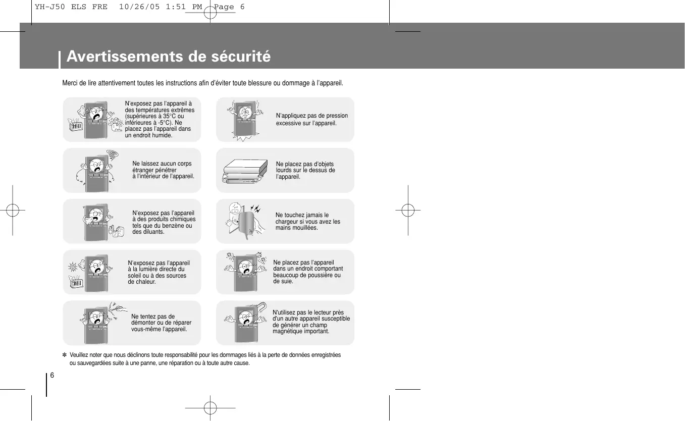 10/26/05 1:51 PM Page 6 Avertissements de sécurité Merci de lire attentivement toutes les instructions afin d’éviter toute blessure ou dommage à l’appareil. N’exposez pas l’appareil à des températures extrêmes (supérieures à 35°C ou inférieures à -5°C). Ne placez pas l’appareil dans un endroit humide. N’appliquez pas de pression excessive sur l’appareil. Ne laissez aucun corps étranger pénétrer à l’intérieur de l’appareil. Ne placez pas d’objets lourds sur le dessus de l’appareil. N’exposez pas l’appareil à des produits chimiques tels que du benzène ou des diluants. Ne touchez jamais le chargeur si vous avez les mains mouillées. N’exposez pas l’appareil à la lumière directe du soleil ou à des sources de chaleur. Ne tentez pas de démonter ou de réparer vous-même l’appareil. Ne placez pas l’appareil dans un endroit comportant beaucoup de poussière ou de suie. N'utilisez pas le lecteur près d'un autre appareil susceptible de générer un champ magnétique important. ✽ Veuillez noter que nous déclinons toute responsabilité pour les dommages liés à la perte de données enregistrées ou sauvegardées suite à une panne, une réparation ou à toute autre cause.