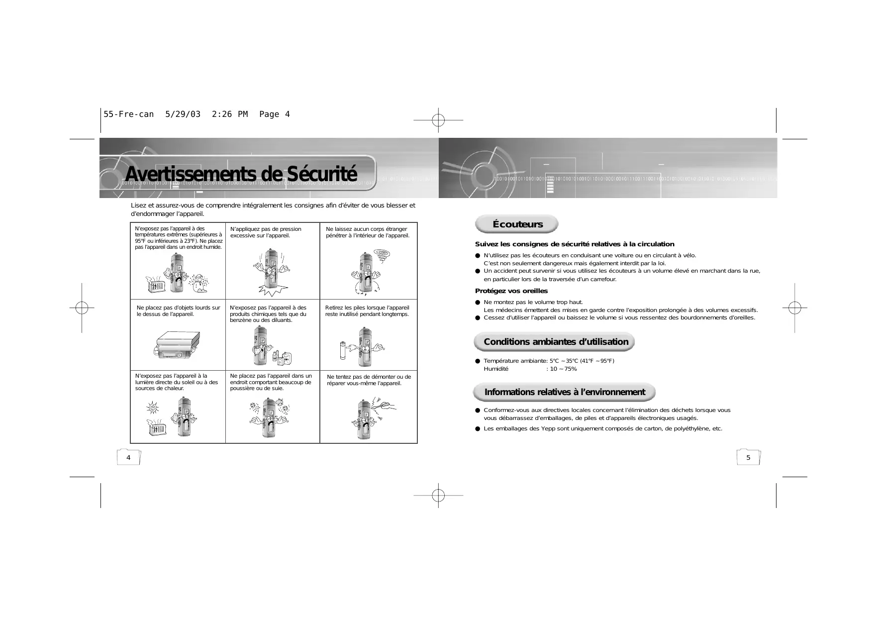 55-Fre-can 5/29/03 2:26 PM Page 4 Avertissements de Sécurité Lisez et assurez-vous de comprendre intégralement les consignes afin d’éviter de vous blesser et d’endommager l’appareil. N’exposez pas l’appareil à des températures extrêmes (supérieures à 95°F ou inférieures à 23°F). Ne placez pas l’appareil dans un endroit humide. N’appliquez pas de pression excessive sur l’appareil. Ne laissez aucun corps étranger pénétrer à l’intérieur de l’appareil. Écouteurs Suivez les consignes de sécurité relatives à la circulation ● N’utilisez pas les écouteurs en conduisant une voiture ou en circulant à vélo. C’est non seulement dangereux mais également interdit par la loi. ● Un accident peut survenir si vous utilisez les écouteurs à un volume élevé en marchant dans la rue, en particulier lors de la traversée d’un carrefour. Protégez vos oreilles Ne placez pas d’objets lourds sur le dessus de l’appareil. N’exposez pas l’appareil à des produits chimiques tels que du benzène ou des diluants. Retirez les piles lorsque l’appareil reste inutilisé pendant longtemps. ● Ne montez pas le volume trop haut. Les médecins émettent des mises en garde contre l’exposition prolongée à des volumes excessifs. ● Cessez d’utiliser l’appareil ou baissez le volume si vous ressentez des bourdonnements d’oreilles. Conditions ambiantes d’utilisation ● Température ambiante: 5°C ~ 35°C (41°F ~ 95°F) Humidité : 10 ~ 75% N’exposez pas l’appareil à la lumière directe du soleil ou à des sources de chaleur. Ne placez pas l’appareil dans un endroit comportant beaucoup de poussière ou de suie. Ne tentez pas de démonter ou de réparer vous-même l’appareil. Informations relatives à l’environnement ● Conformez-vous aux directives locales concernant l’élimination des déchets lorsque vous vous débarrassez d’emballages, de piles et d’appareils électroniques usagés. ● Les emballages des Yepp sont uniquement composés de carton, de polyéthylène, etc.