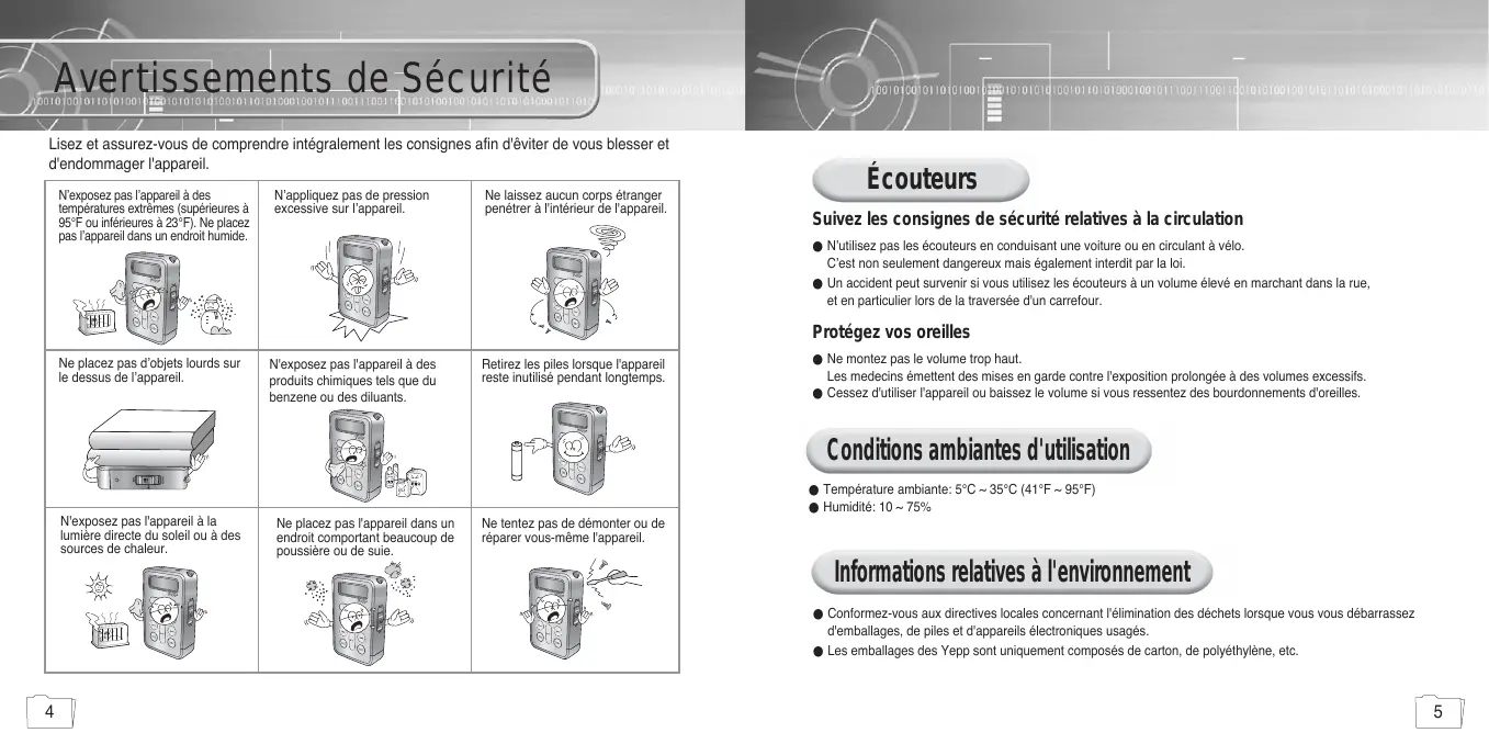 Avertissements de Sécurité Lisez et assurez-vous de comprendre intégralement les consignes afin d'êviter de vous blesser et d'endommager l'appareil. N’exposez pas l’appareil à des températures extrêmes (supérieures à 95°F ou inférieures à 23°F). Ne placez pas l’appareil dans un endroit humide. N’appliquez pas de pression excessive sur l’appareil. Ne laissez aucun corps étranger penétrer à l'intérieur de l'appareil. Écouteurs Suivez les consignes de sécurité relatives à la circulation ● N’utilisez pas les écouteurs en conduisant une voiture ou en circulant à vélo. C’est non seulement dangereux mais également interdit par la loi. ● Un accident peut survenir si vous utilisez les écouteurs à un volume élevé en marchant dans la rue, et en particulier lors de la traversée d'un carrefour. Protégez vos oreilles Ne placez pas d’objets lourds sur le dessus de l’appareil. N'exposez pas l'appareil à des produits chimiques tels que du benzene ou des diluants. Retirez les piles lorsque l'appareil reste inutilisé pendant longtemps. ● Ne montez pas le volume trop haut. Les medecins émettent des mises en garde contre l'exposition prolongée à des volumes excessifs. ● Cessez d'utiliser l'appareil ou baissez le volume si vous ressentez des bourdonnements d'oreilles. Conditions ambiantes d'utilisation ● Température ambiante: 5°C ~ 35°C (41°F ~ 95°F) ● Humidité: 10 ~ 75% N'exposez pas l'appareil à la lumière directe du soleil ou à des sources de chaleur. Ne placez pas l'appareil dans un endroit comportant beaucoup de poussière ou de suie. Ne tentez pas de démonter ou de réparer vous-même l'appareil. Informations relatives à l'environnement ● Conformez-vous aux directives locales concernant l'élimination des déchets lorsque vous vous débarrassez d'emballages, de piles et d'appareils électroniques usagés. ● Les emballages des Yepp sont uniquement composés de carton, de polyéthylène, etc.