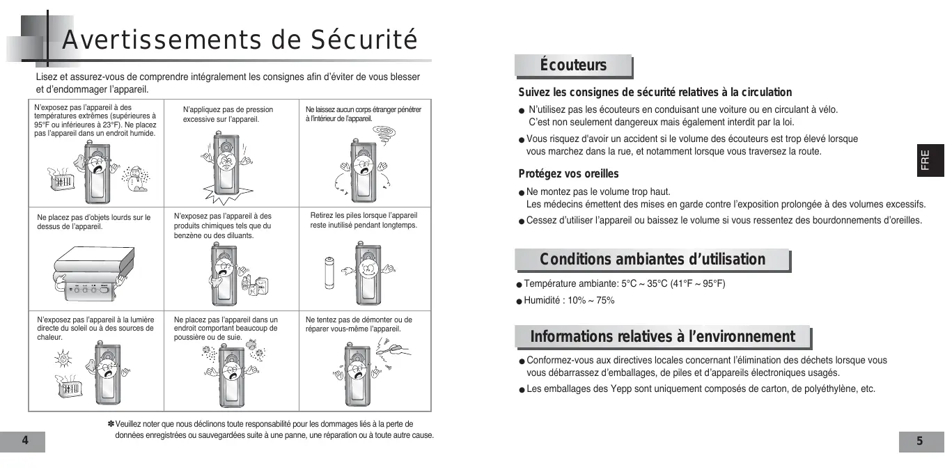 Avertissements de Sécurité N’exposez pas l’appareil à des températures extrêmes (supérieures à 95°F ou inférieures à 23°F). Ne placez pas l’appareil dans un endroit humide. N’appliquez pas de pression excessive sur l’appareil. Ne laissez aucun corps étranger pénétrer à l’intérieur de l’appareil. Écouteurs Suivez les consignes de sécurité relatives à la circulation