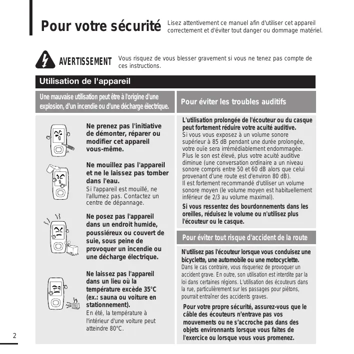 Pour éviter les troubles auditifs L'utilisation prolongée de l'écouteur ou du casque peut fortement réduire votre acuité auditive. Si vous vous exposez à un volume sonore supérieur à 85 dB pendant une durée prolongée, votre ouïe sera irrémédiablement endommagée. Plus le son est élevé, plus votre acuité auditive diminue (une conversation ordinaire a un niveau sonore compris entre 50 et 60 dB alors que celui provenant d’une route est d'environ 80 dB). Il est fortement recommandé d'utiliser un volume sonore moyen (le volume moyen est habituellement inférieur de 2/3 au volume maximal). Si vous ressentez des bourdonnements dans les oreilles, réduisez le volume ou n'utilisez plus l'écouteur ou le casque. Pour éviter tout risque d'accident de la route N'utilisez pas l'écouteur lorsque vous conduisez une bicyclette, une automobile ou une motocyclette. Dans le cas contraire, vous risqueriez de provoquer un accident grave. En outre, son utilisation est interdite par la loi dans certaines régions. L'utilisation des écouteurs dans la rue, particulièrement sur les passages pour piétons, pourrait entraîner des accidents graves. Pour votre propre sécurité, assurez-vous que le câble des écouteurs n’entrave pas vos mouvements ou ne s’accroche pas dans des objets environnants lorsque vous faites de l'exercice ou lorsque vous vous promenez. Suivez attentivement ces instructions sous peine de provoquer des blessures physiques ou d'endommager l'appareil. FRA ATTENTION Utilisation de l'appareil Utilisez votre appareil de façon à éviter tout dysfonctionnement ou tout accident. Lorsque vous portez l'appareil autour du cou, n’exercez pas de pression excessive sur la cordelette. Gestion des données importantes Veillez à toujours enregistrer vos données les plus importantes Notez bien que nous ne saurons être tenus responsables en cas de perte des données due à une panne, à une réparation ou à toute autre cause. Evitez de causer des dysfonctionnements Evitez tout impact brutal sur l'appareil (ex. : en cas de chute). Ne posez pas d'objets lourds sur le dessus de l'appareil. Empêchez que des particules externes ou de la poussière ne pénètrent dans l'appareil. Utilisez toujours les accessoires fournis ou agréés par Samsung. Evitez toute projection d’eau sur l'appareil. Ne nettoyez jamais l'appareil à l'aide de produits chimiques (ex. : benzène ou diluant) sous peine de provoquer un incendie, une décharge électrique ou une détérioration de la surface. Ne posez jamais l'appareil à proximité d'objets émettant des ondes électromagnétiques sous peine de provoquer un dysfonctionnement.