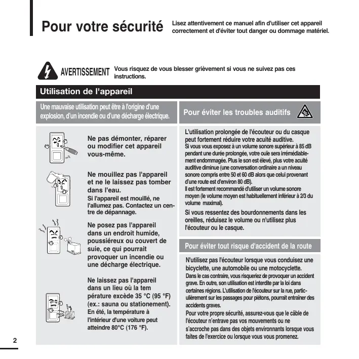 Pour votre sécurité AVERTISSEMENT WARNING Lisez attentivement ce manuel afin d'utiliser cet appareil correctement et d'éviter tout danger ou dommage matériel. Vous risquez de vous blesser grièvement si vous ne suivez pas ces instructions. Utilisation de l'appareil Une mauvaise utilisation peut être à l'origine d'une explosion, d’un incendie ou d’une décharge électrique. Ne pas démonter, réparer ou modifier cet appareil vous-même. Ne mouillez pas l'appareil et ne le laissez pas tomber dans l'eau. Si l'appareil est mouillé, ne l'allumez pas. Contactez un centre de dépannage. Ne posez pas l'appareil dans un endroit humide, poussiéreux ou couvert de suie, ce qui pourrait provoquer un incendie ou une décharge électrique. Ne laissez pas l'appareil dans un lieu où la tem pérature excède 35 °C (95 °F) (ex.: sauna ou stationement). En été, la température à l'intérieur d'une voiture peut atteindre 80°C (176 °F).